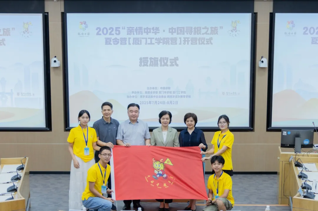 福建省侨联副主席齐志,厦门市侨联主席陈俊泳、副主席杜瑞田,厦门工学院副董事长、执行校长李雄虎共同为本期夏令营授旗。
