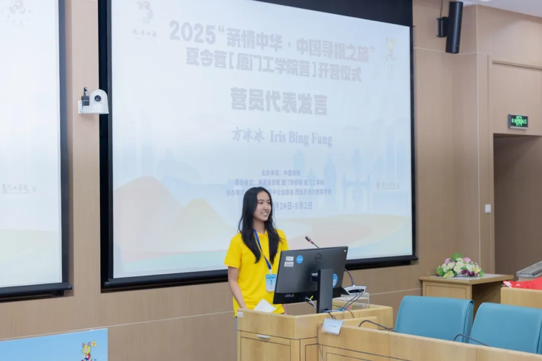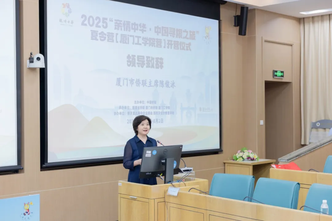 厦门市侨联主席陈俊泳在致辞中向营员们介绍了福建和厦门基本情况。她表示,福建位于中国东南部,是侨务大省,历史悠久,文化丰富;厦门作为经济特区与侨乡,风光秀丽,人文底蕴深厚。她说:“本期夏令营,厦门工学院的老师们精心为同学们开设了丰富多彩的课程,愿大家既能尽览闽南风土人情的鲜活画卷,体悟中华文化的厚重底蕴,又能触摸中国式现代化的时代脉搏,感受其蓬勃生机。”她期望同学们通过本次“寻根之旅”增长见识,收获友谊与成长,增进与祖(籍)国、与福建、与厦门的情感联结,并将此行的所见所感分享给家人和身边的朋友,成为中国声音的传播者、中国故事的讲述者、中外文化交流的践行者!