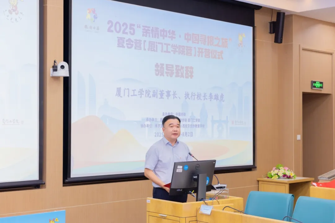 厦门工学院副董事长、执行校长李雄虎向来自美国、西班牙、缅甸、印度尼西亚、中国香港的青少年朋友们表示最热烈的欢迎。他深情阐释了“寻根之旅”的意义——“既是跨越山海的血脉邀约,更是向文化母体深情回望的精神归航”。中华文化之所以历久弥新,在于它既有“不忘本来”的根,也有“吸收外来”的胸怀,更有“面向未来”的格局。厦门工学院始终坚持以中华优秀传统文化滋养现代大学精神,以科技与人文交融的教育生态培育堪当民族复兴重任的时代新人。他提到,厦门工学院以“十二馆八园”人文景观与七个产业学院为载体,将中国传统非物质文化遗产的“诗情画意”与现代最前沿的人工智能科技实验场、教学场相结合,构建传统与现代交融的教育生态。期待营员们在此,通过课堂教学、文化实践和参观访问,体验闽南独特风采,学习中华传统文化与前沿人工智能,“找到中华文化的根,也拥有拥抱未来的钥匙”。