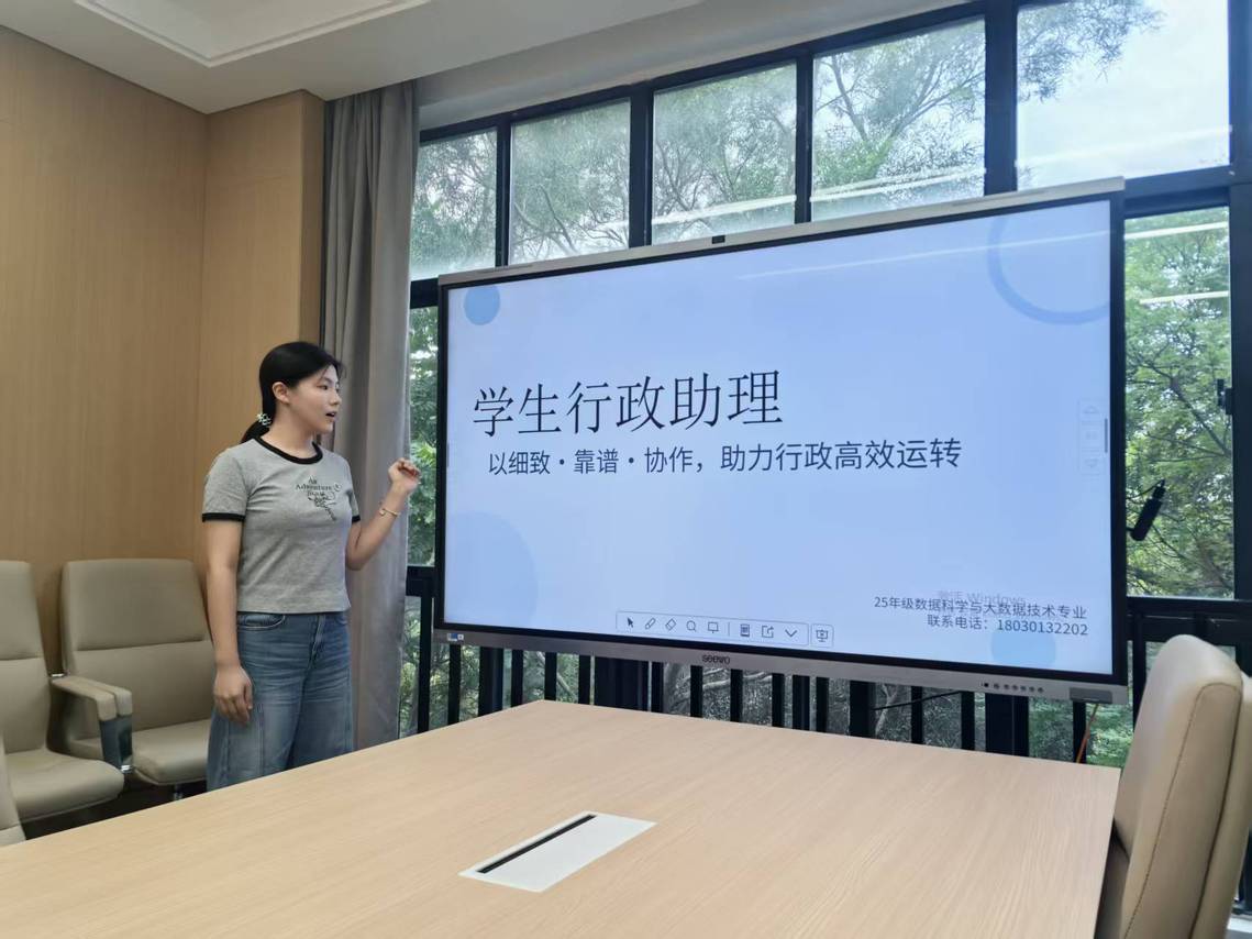 面试环节中,评审团先通过候选人的 PPT 展示,直观评估其与岗位的适配度;随后以情景化提问为切入点,深入考验候选人的临场应变与问题解决能力。本次选拔目标清晰,旨在发掘并录用集责任心、协作力、执行力、思维力于一身的优秀学生助理,为学院日常工作高效推进注入新鲜动力。