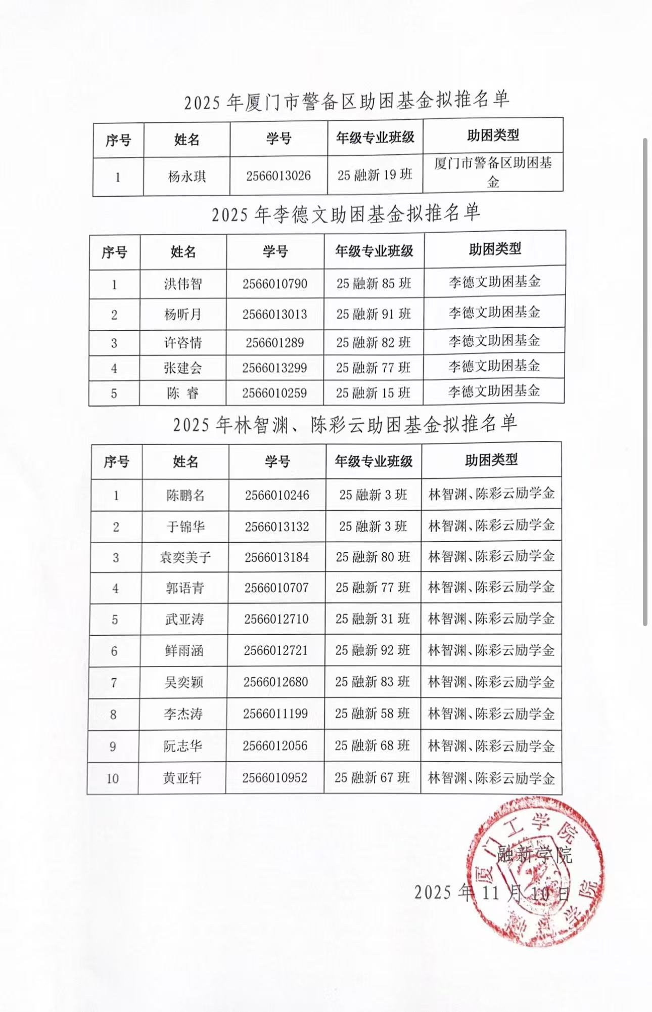 为切实做好我校2025年资助评选工作,进一步激励学生刻苦学习,奋发向上,全面发展,成为社会有用的人才。我院组织了2025年融新学院“李德文助困基金”、“林智渊、陈彩云励学金”和“厦门市警备区助困基金”的评选工作。