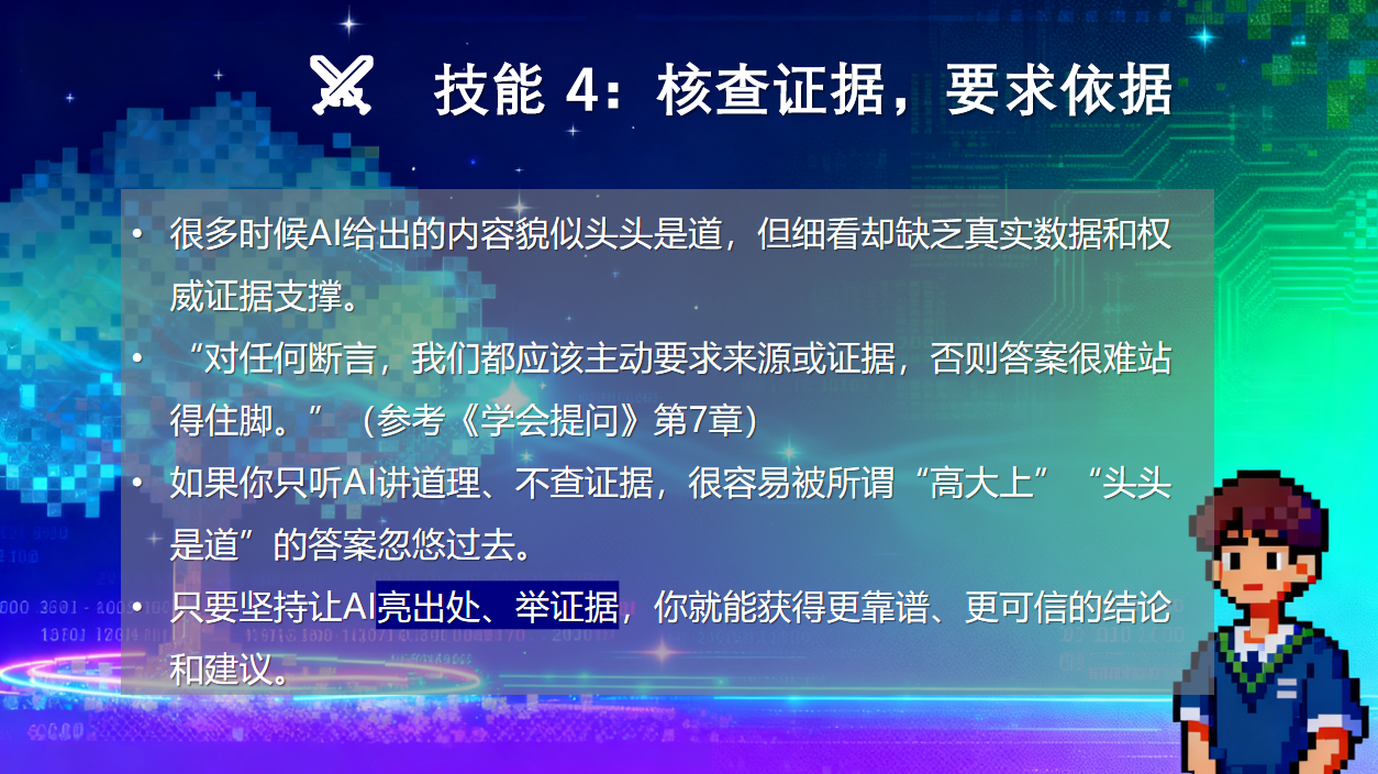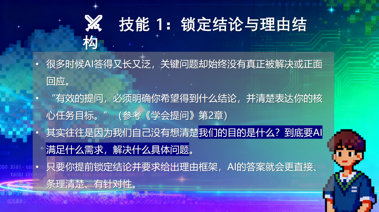 围绕批判性思维指导下的AI提问方法论,李铭佳老师重点讲解了四项核心技能: