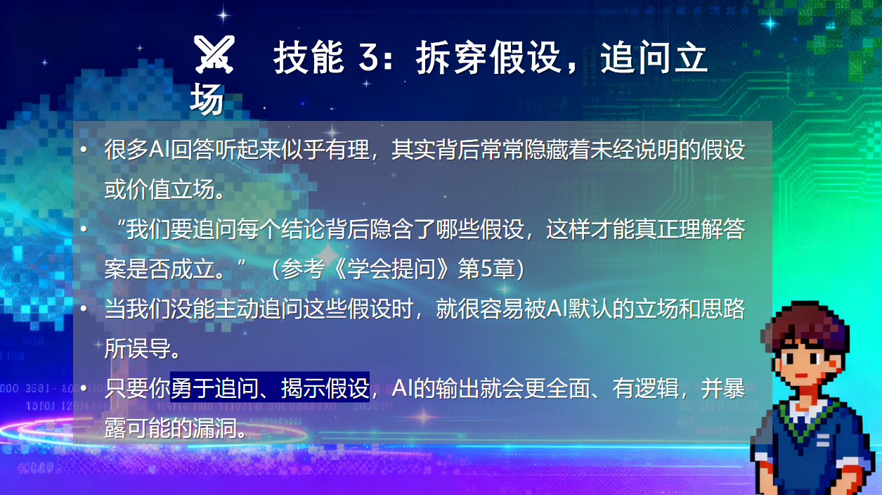 3. 拆穿假设,追问立场。学会将AI从“叙述者”变为“思维沙盘”,通过挑战其逻辑基础来迫使AI展现更多面更立体的视角。