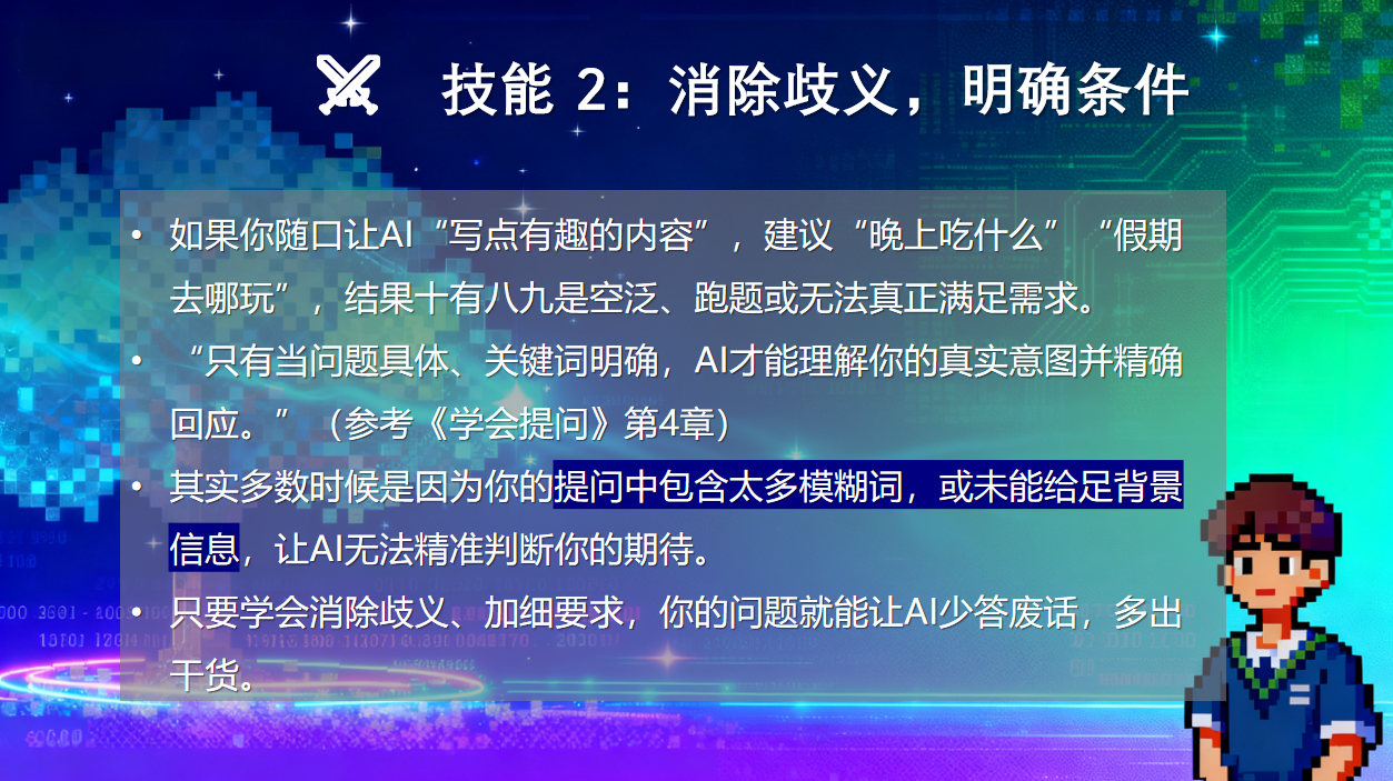 2. 消除歧义,明确条件。通过设定具体条件与上下文,将AI的“广撒网式猜测”变为“精准制导回应”,从而直接获得高相关性的优质回复。