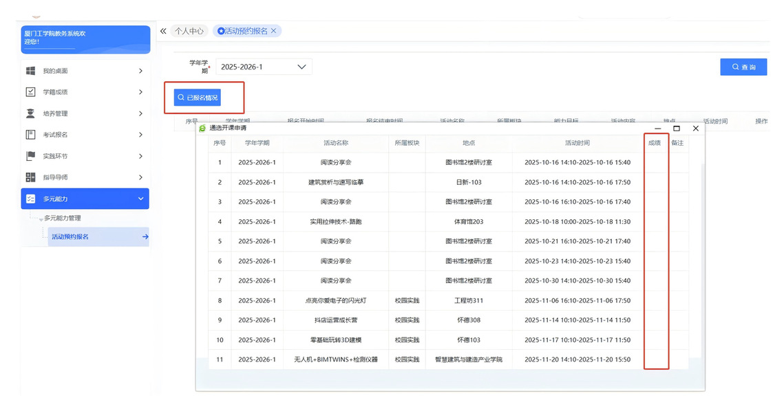 进入活动预约报名界面,点击【已报名情况】,可查看本学期已报名的多元项目及成绩。