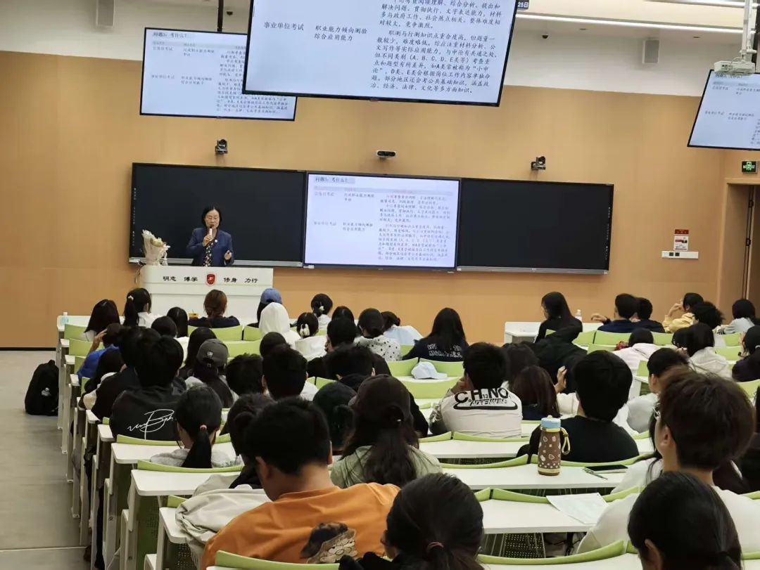 刘爱琳老师在讲座中指出,许多新生存在“考公是大四的事”这一认知误区。她强调,从大一开始准备考公考编,能够有效避免后期学业与备考的时间冲突,同时为学生提供充足的时间探索职业方向、积累核心能力,真正实现“赢在起跑线”。
