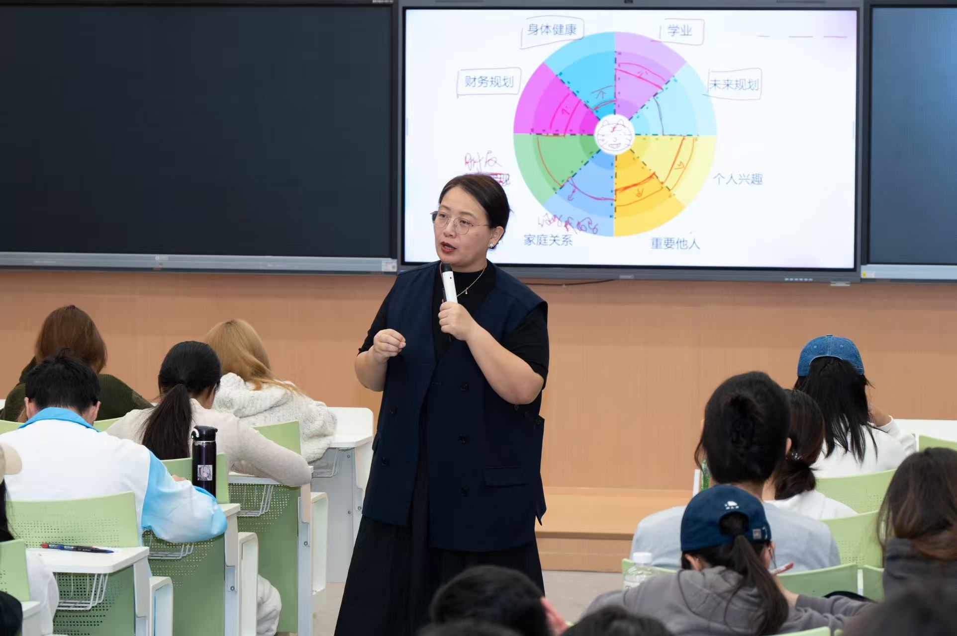 在多角色平衡板块,瞿老师通过辨析“假我”与“真我”的冲突,引导同学们剥离外界期待,回归内心真正的价值追求。结合“生涯彩虹图”,她展示了人在不同人生阶段肩负的子女、学习者、工作者、伴侣等多重角色,并用“生涯平衡轮”工具,指导同学们量化自身各维度状态,学习科学统筹、动态调整的平衡技巧。