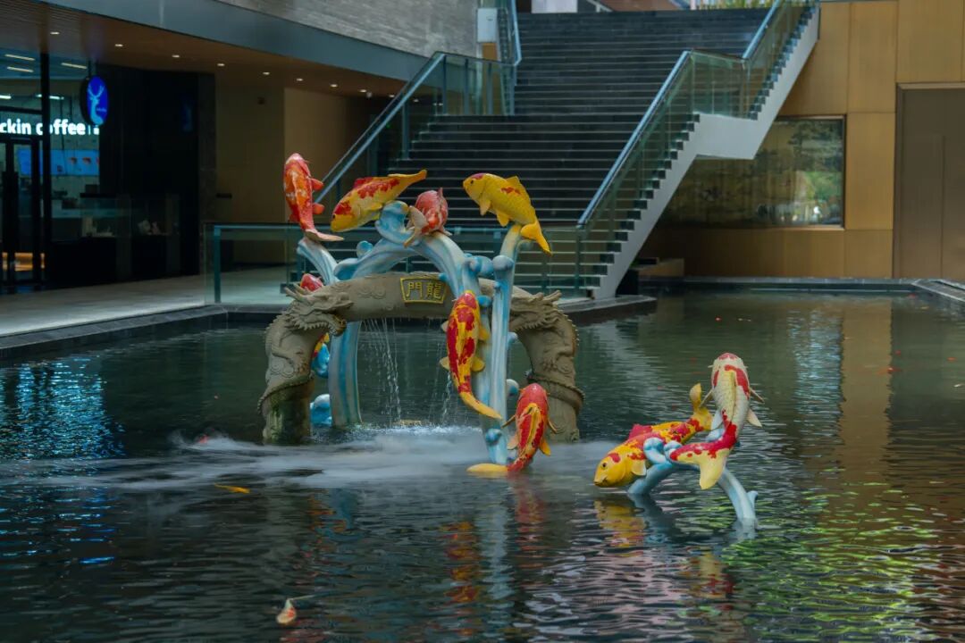 大厅中央,一池碧水如鉴,泉水喷扬;一池锦鳞成群,游弋嬉戏。“倏忽龙腾锦浪,悠然云起青渊”,澄澈的水景映照出“鲤鱼跃龙门”的灵动。抬首望去,通透的玻璃护栏与连接上下的开阔楼梯共同构筑了一个开阔通透、灵活多元的公共区域。这里不仅是知识的通道,更是凝神静思、交流互动的场所。