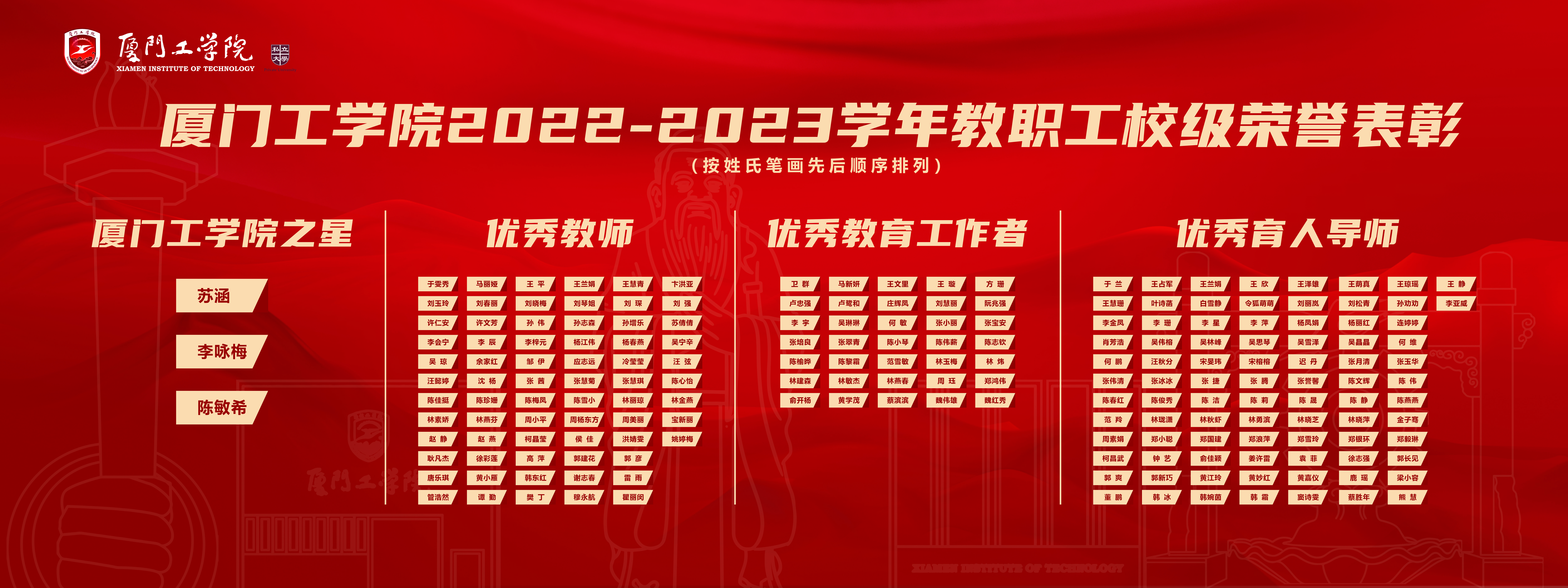 厦门工学院2022-223学年教职工校级荣誉表彰名单