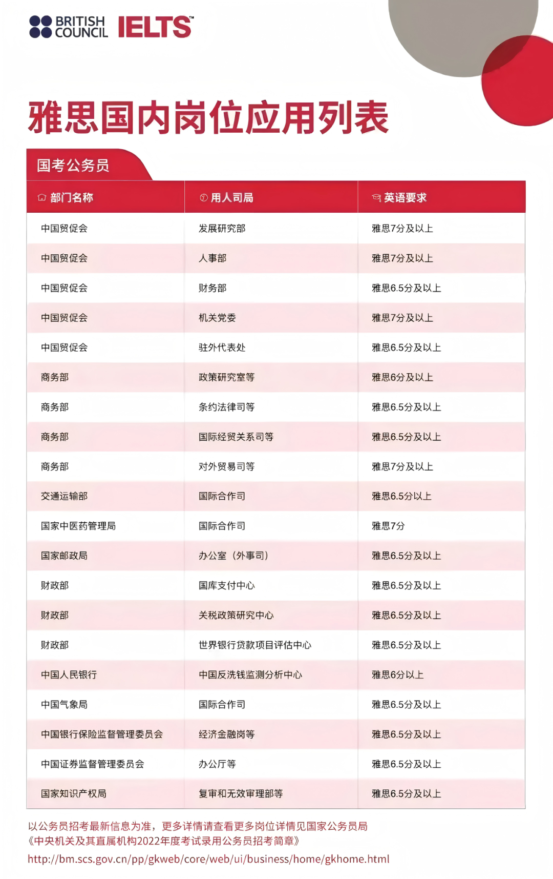 雅思成绩在就业市场上同样含金量十足。特别是国家公务员考试中,众多涉外部委岗位明确要求或认可雅思成绩。