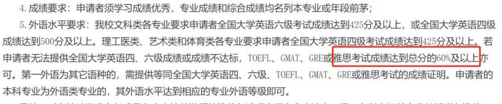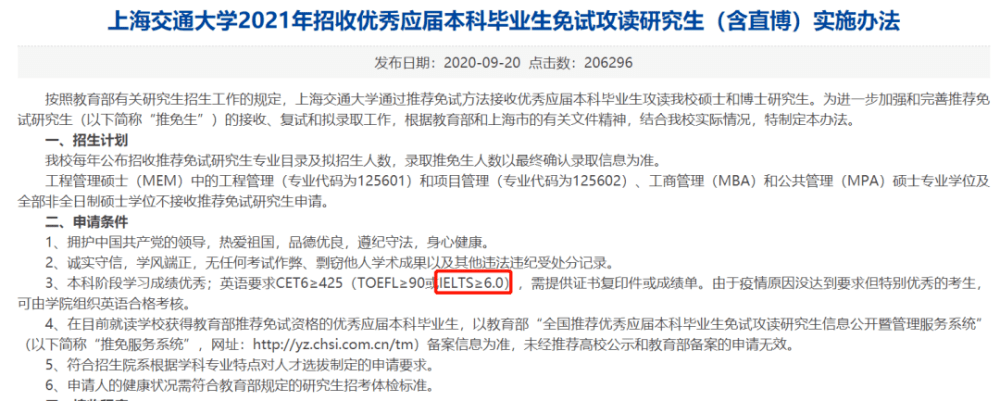 以上海交通大学、厦门大学为例,其推免生(保研)申请条件中明确表示:雅思6.0分及以上可作为英语水平证明,部分专业甚至要求更高。