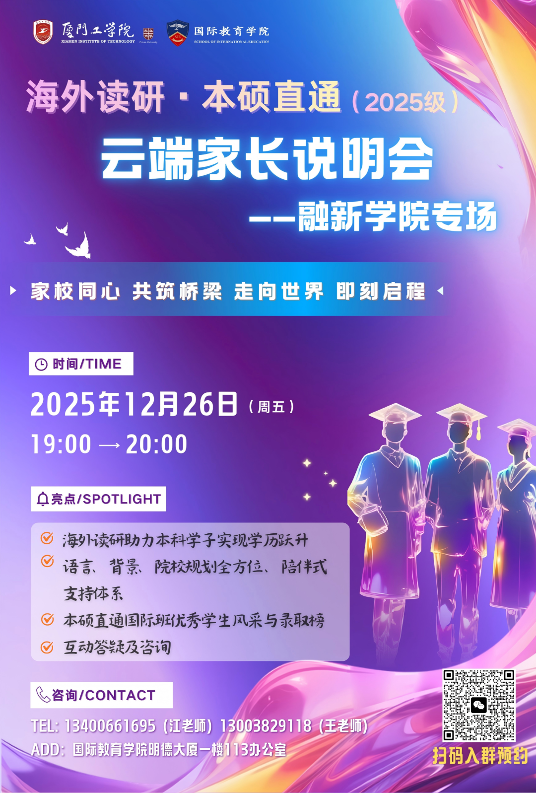 2025年12月26日(周五)晚19:00,国际教育学院“海外读研·本硕直通”项目云端家长说明会(融新学院专场)将准时线上举行,特别面向2025级的学生及家长开放!
