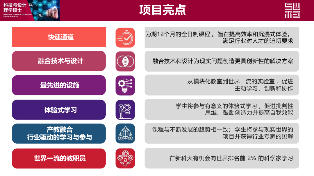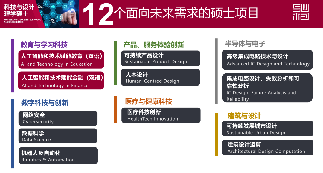 SUTD提供“科技与设计理学硕士”(Master of Science in Technology and Design,简称MTD)项目,下设12个前沿方向,覆盖教育与学习科技、数字科技与创新、产品与服务创新体验、医疗与健康科技、半导体与电子、建筑与设计等多个数字时代高需求领域。