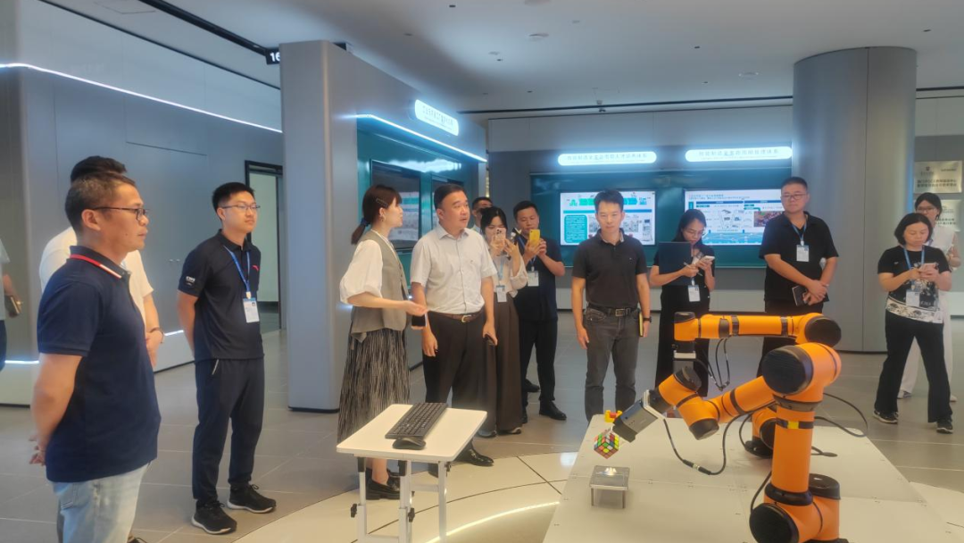 在现场,参与调研的校领导及相关单位人员首先参访了各个专业产业学院的展厅以及下设的工作坊或实验室,体验各专业产业学院的仪器设备及产品功能等,听取各专业产业学院负责人关于建设规划、项目计划、企业教师聘任、课程安排、专项工作等汇报以及相关待解决的事项。