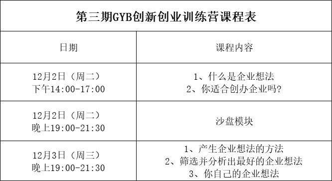学校组织开展第三期GYB创新创业训练营,具体通知如下: