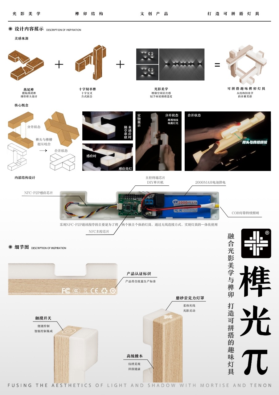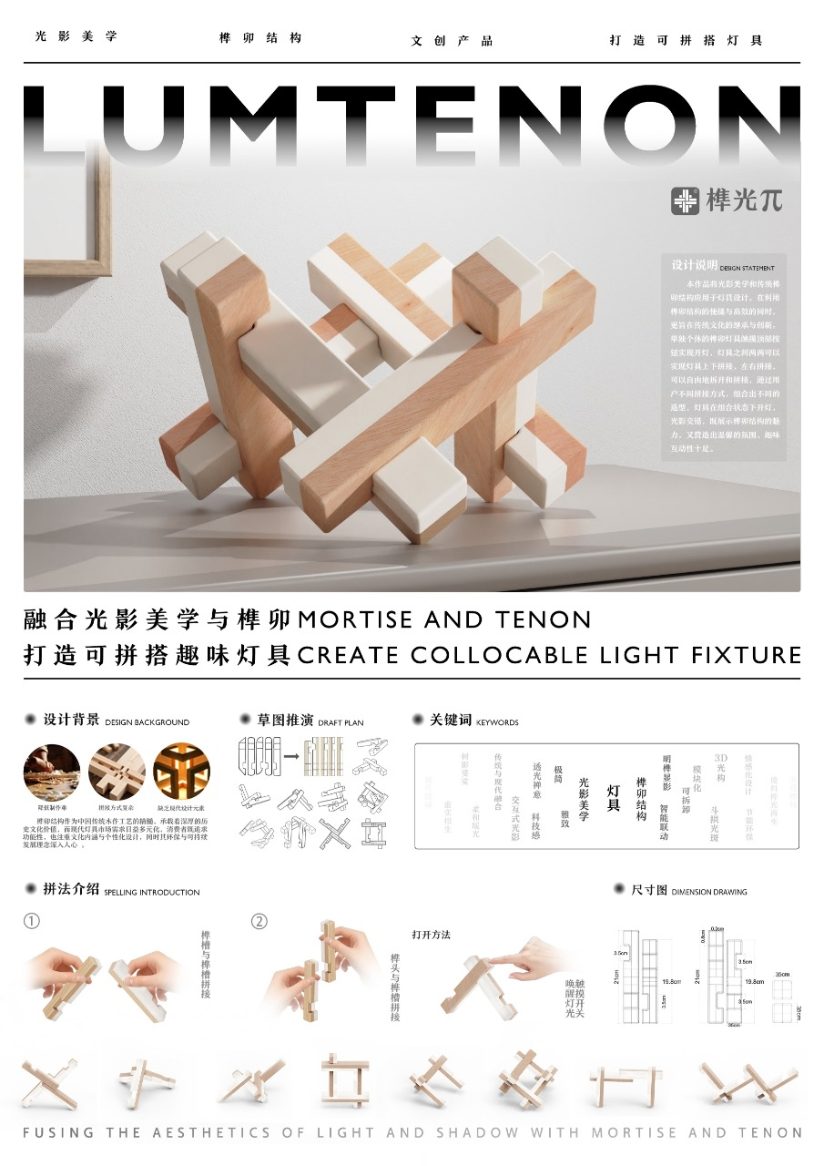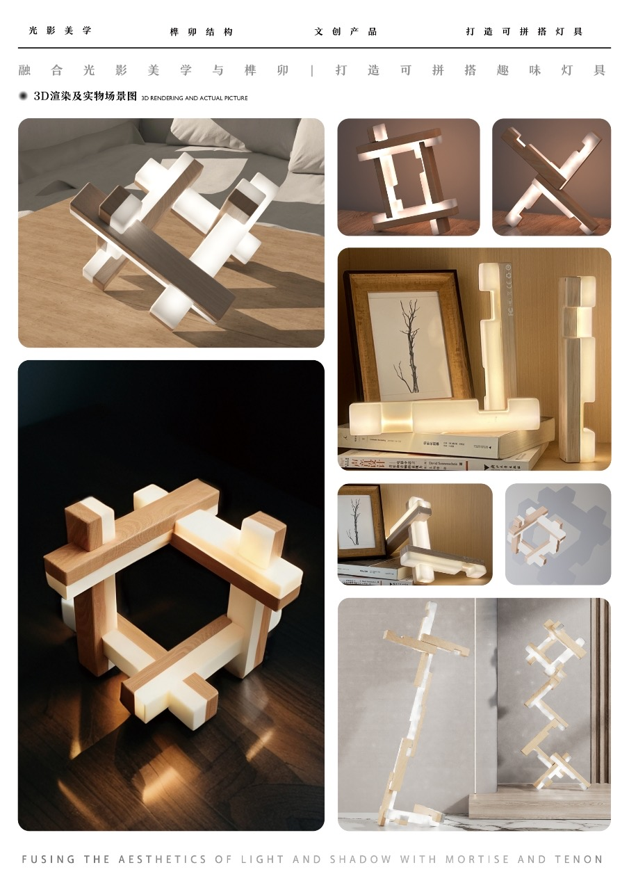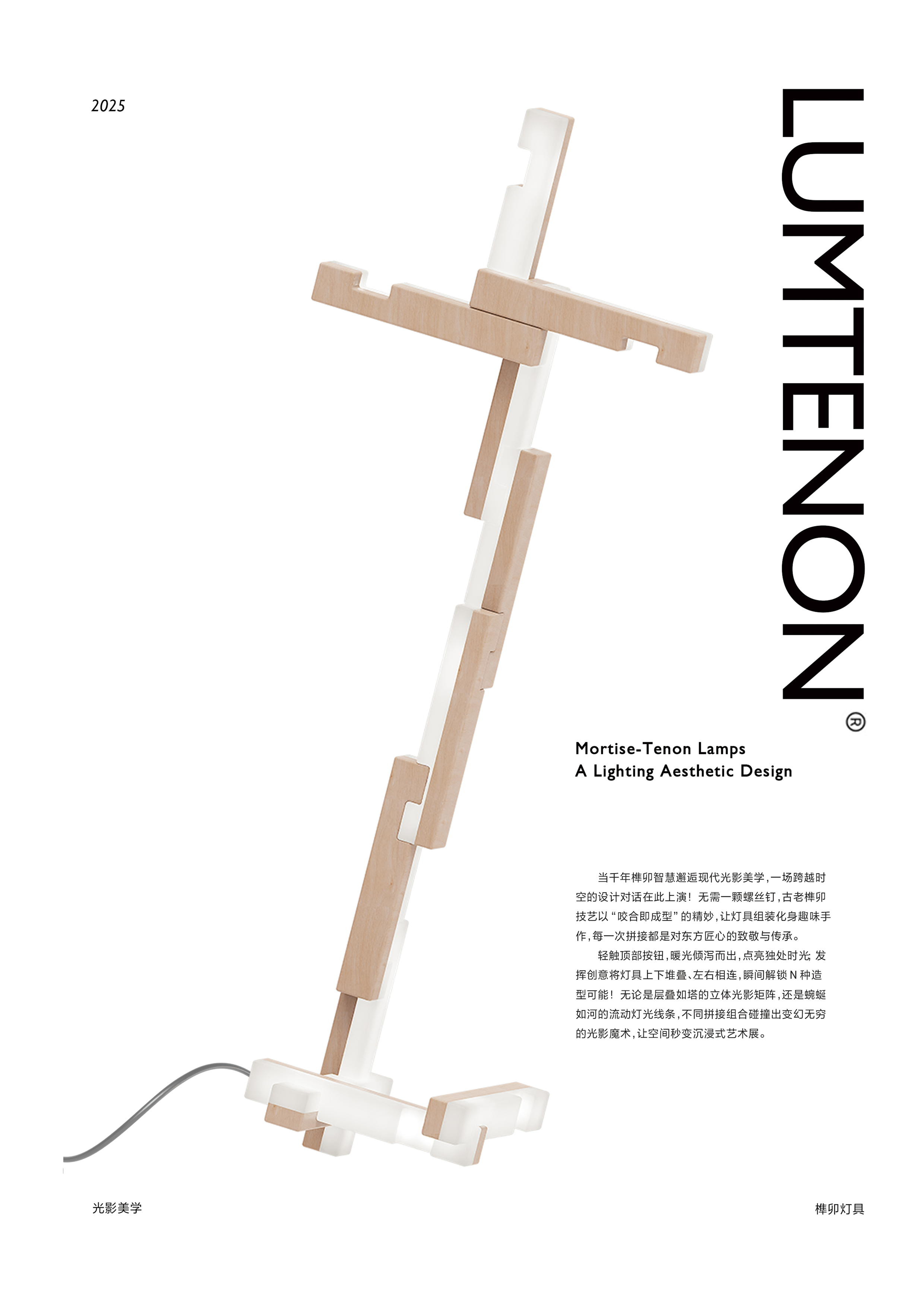 “榫光π”是一款基于光影美学和中国传统榫卯结构设计的模块化智能灯具。它深度挖掘榫卯工艺(如燕尾榫、格角榫等)的精髓,将其巧妙应用于现代照明产品,旨在实现传统文化与现代科技的完美融合。该灯具个体可以自由拼接、堆叠,无需钉子或胶水即可稳固连接。通过创新性的设计,它能够解锁N种造型组合,让用户在搭建过程中体验互动乐趣,并利用其产生的独特光影效果,营造出富有文化底蕴和疗愈感的沉浸式光影艺术空间。