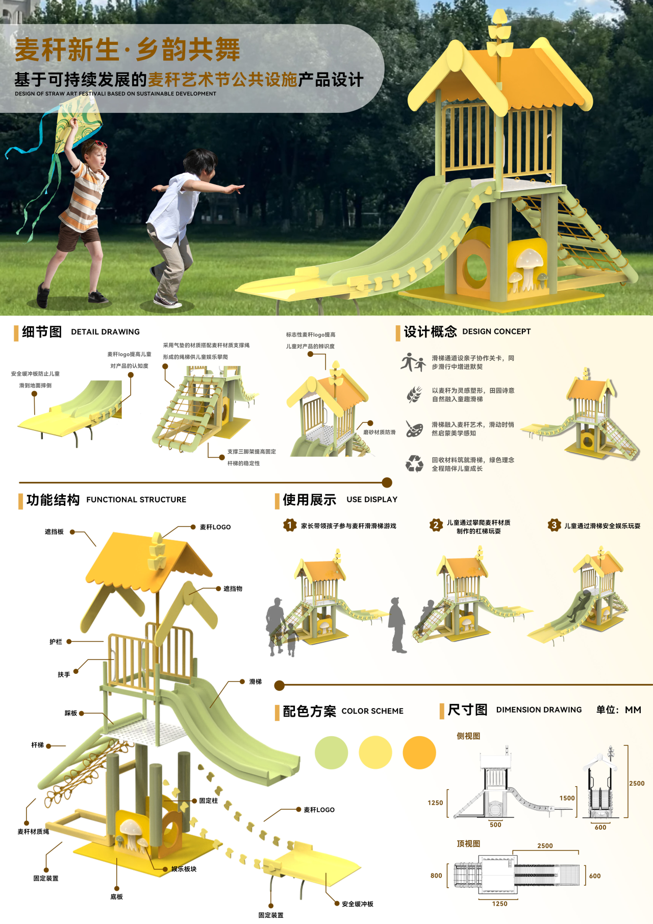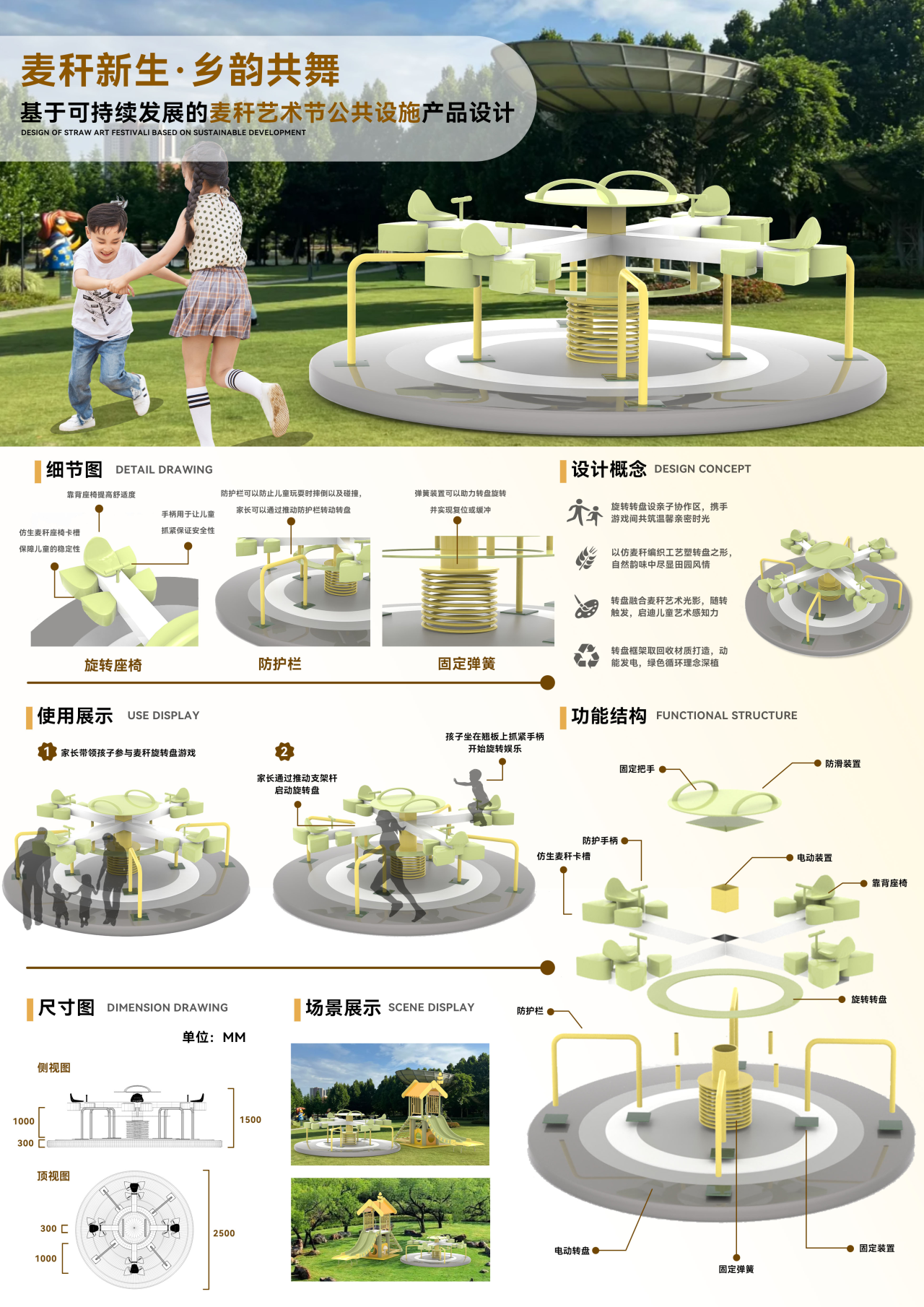 项目是基于麦秆艺术节的可持续公共设施设计。项目以麦秆循环为核心,构建“回收-创作-展览-反哺”的闭环链条:首先收集废弃麦秆作为原材料,经艺术加工转化为在地性公共艺术展品与设施;通过麦秆艺术节及常态化展览吸引游客体验消费,带动区域文旅经济;最终将部分收益定向反馈给麦秆回收环节,激励农户持续参与,形成环保、艺术与社区经济互促的良性循环,实现生态价值、文化价值与经济价值的有机统一。