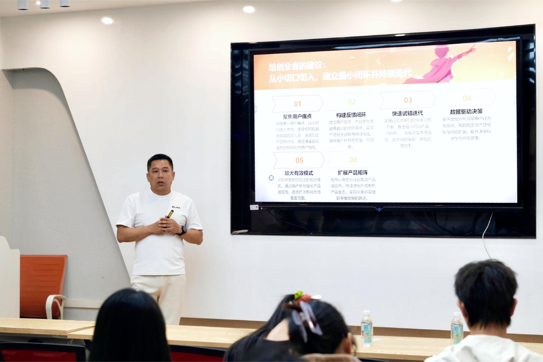 陈飞老师提出,学生创业者的核心优势在于整合资源的能力,应积极将校园人脉转化为早期用户与口碑基础。他建议以学校为“首站试验场”,收集初始反馈、优化产品,从而在资源有限的情况下将短板转化为成长动力。