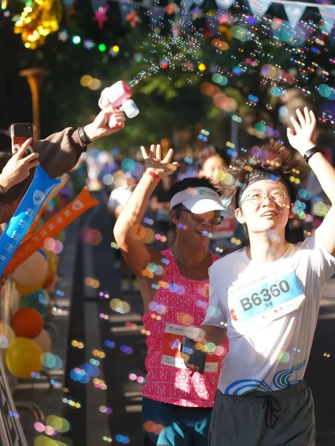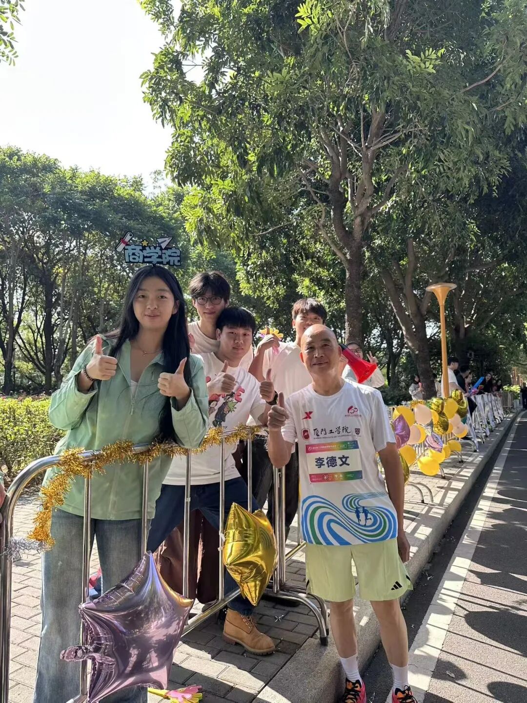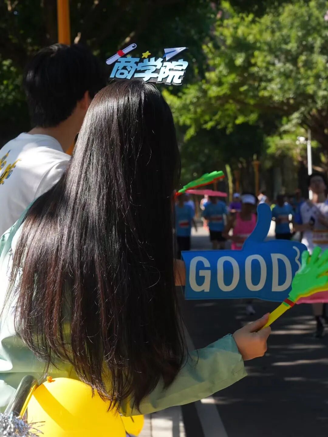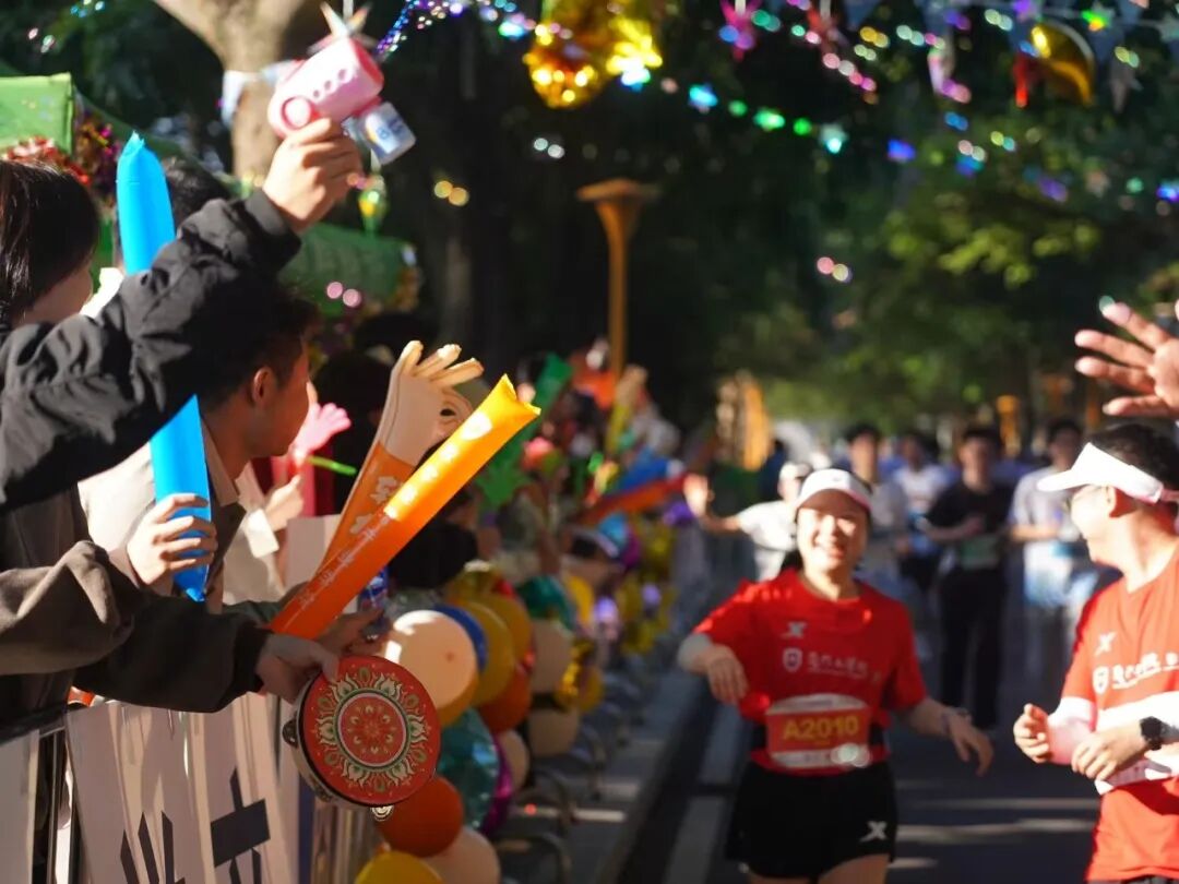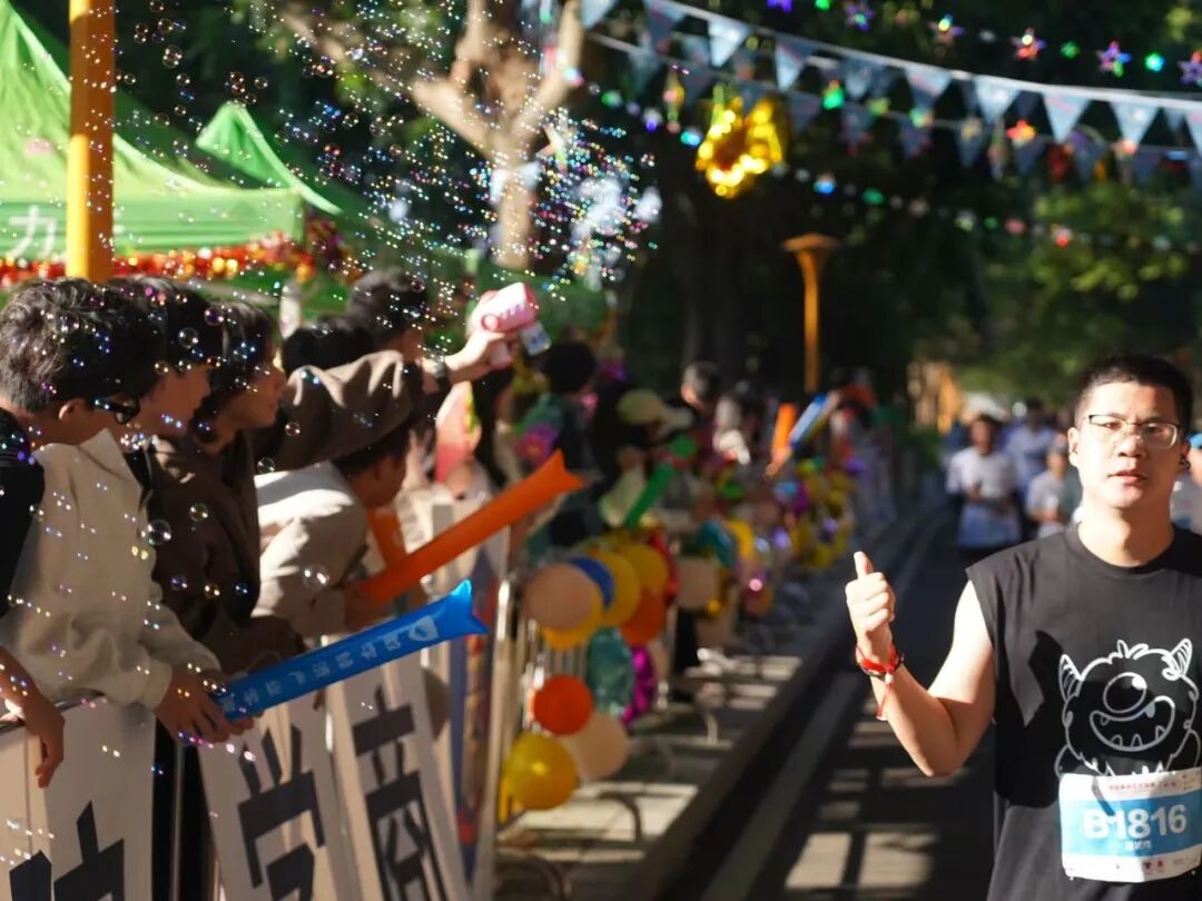 赛事过程中,气氛组同学齐聚商学院大本营两侧,以汽笛、音乐与口号点燃赛场热情。随着动感节奏,他们挥动气球,齐声高喊“加油!你们是最棒的!”,声声鼓励如暖流般传递力量,温暖了每一位经过的跑者。