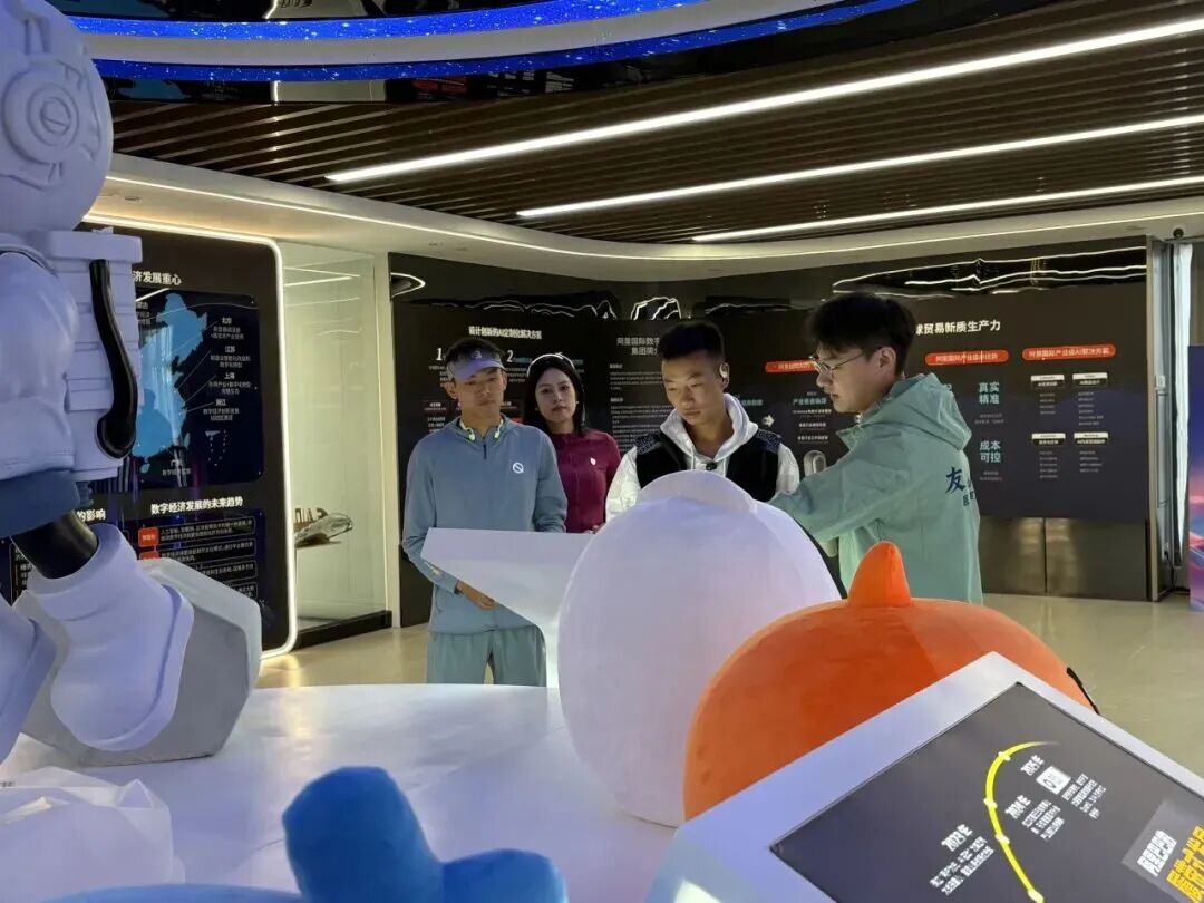 活动步入“科技+体育”创新体验环节。工作人员为大家介绍数字产业经济学院阿里巴巴板块,展现智慧体育与马拉松的融合探索。AI相机成为焦点,吴浩然与管油胜体验生成专属影像并签名留念,将科技之光与奔跑精神巧妙交融。