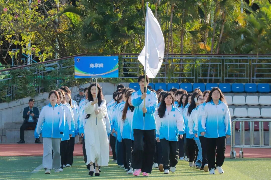 体育文化节开幕式上,商学院代表团步伐整齐、意气风发。统一的着装、挺拔的身姿,展现出商科学子严谨务实、积极向上的精神风貌。院旗高扬,“商学院”三字格外醒目,象征着团结与协作。