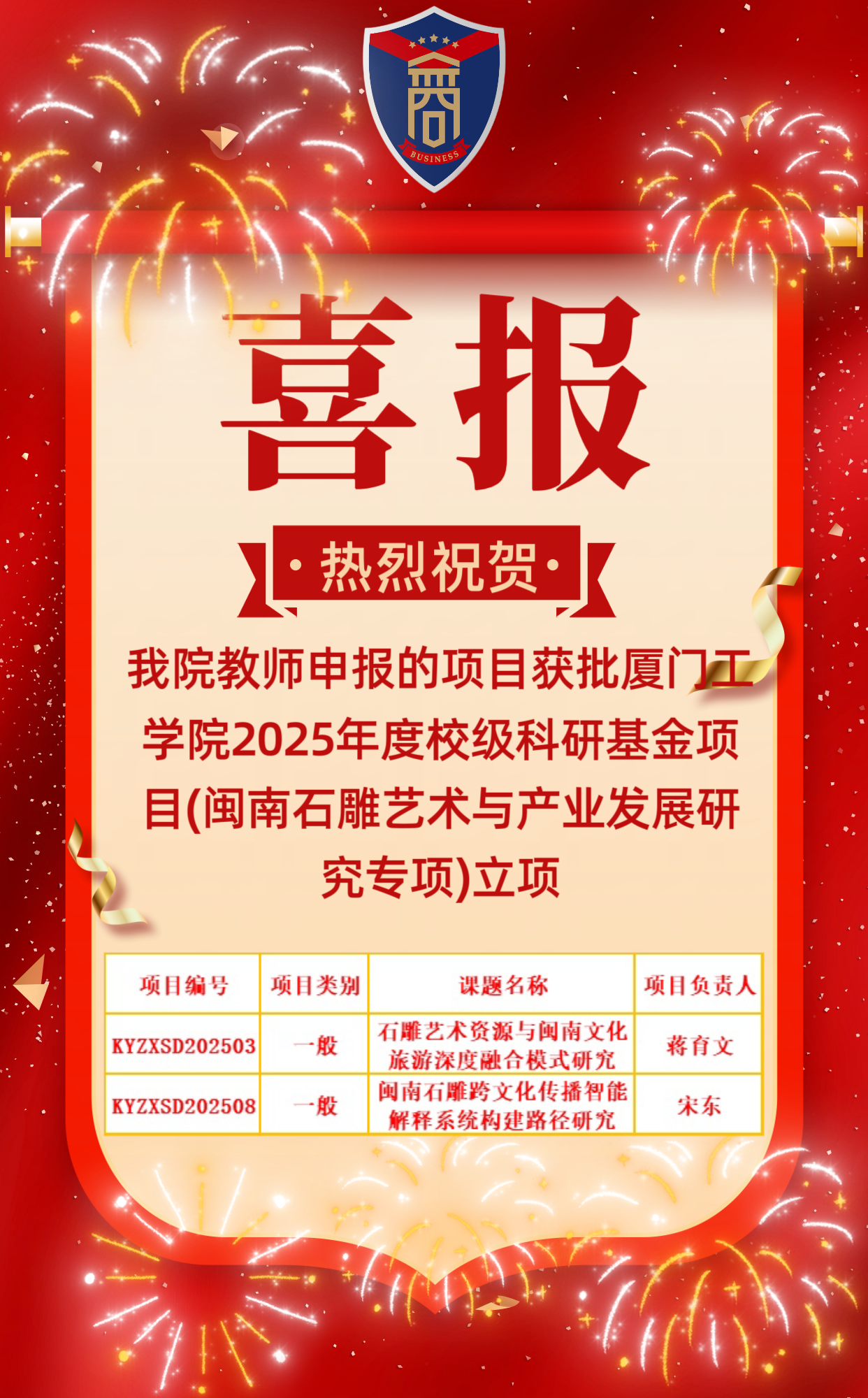 近日,厦门工学院2025年度校级科研基金项目(闽南石雕艺术与产业发展研究专项)立项结果公布。商学院蒋育文老师主持的《石雕艺术资源与闽南文化旅游深度融合模式研究》(项目编号:KYZXSD202503)、宋东老师主持的《闽南石雕跨文化传播智能解释系统构建路径研究》(项目编号:KYZXSD202508)均获得立项。