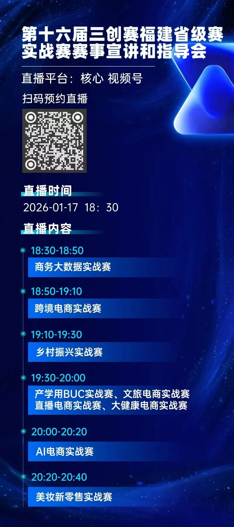 为进一步加强师生对第十六届三创赛各实战赛的了解,福建省竞组委邀请了各实战赛技术平台,于1月17日18点30分开始,通过线上直播的方式,为大家逐一介绍各说明各实战的基本情况。欢迎学校报名三创赛实战赛道的师生及时关注收看!