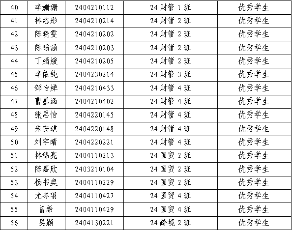 根据《关于开展2024-2025学年“优秀学生”和“最美学生”评选工作的通知》,经个人申请,班级审核,学院院务委员会评选推荐,拟推荐林冬季、张译文2名同学参评2024-2025学年厦门工学院最美学生的评选;拟推荐戴佳莉等56名同学参评2024-2025学年厦门工学院优秀学生的评选,现对拟推荐名单予以公示,具体名单如下: