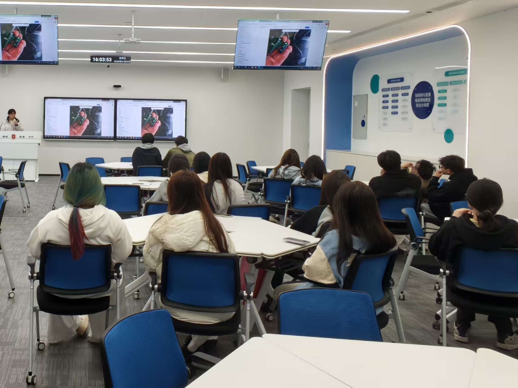 厦门工学院数智传媒产业学院美丽加芬寒假社会化实战项目首次培训,于2026年1月4日在实训基地顺利落幕。继2025年 12 月项目启动且实现订单突破后,本次寒假项目将延续与美丽加芬的深度合作,聚焦 “直播 + 短视频” 双赛道深化运营,同步扩容学生团队、优化人员配置,为寒假期间的实战运营筑牢专业基础。