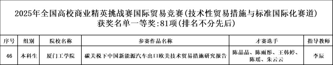 厦门工学院首度组队参与此项赛事。在学校的大力支持与李辰老师的悉心指导下,参赛团队精益求精,持续打磨与优化参赛项目。最终,他们凭借作品《碳关税下中国新能源汽车出口欧美技术贸易措施研究报告》在全国总决赛中表现突出,荣获佳绩,成功展现了学校的教学成果与学生团队的专业实力。