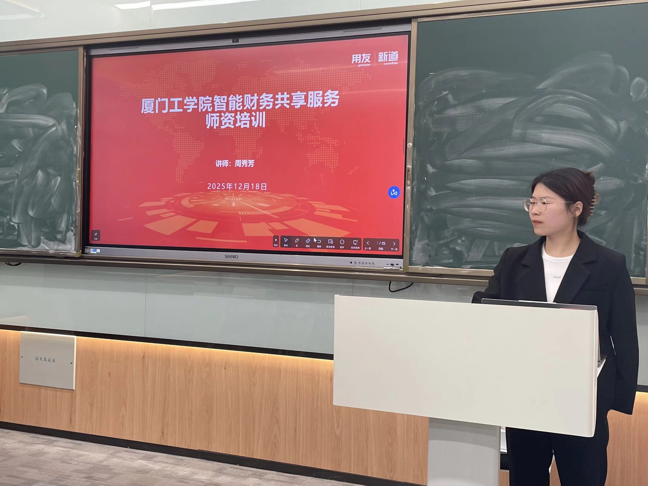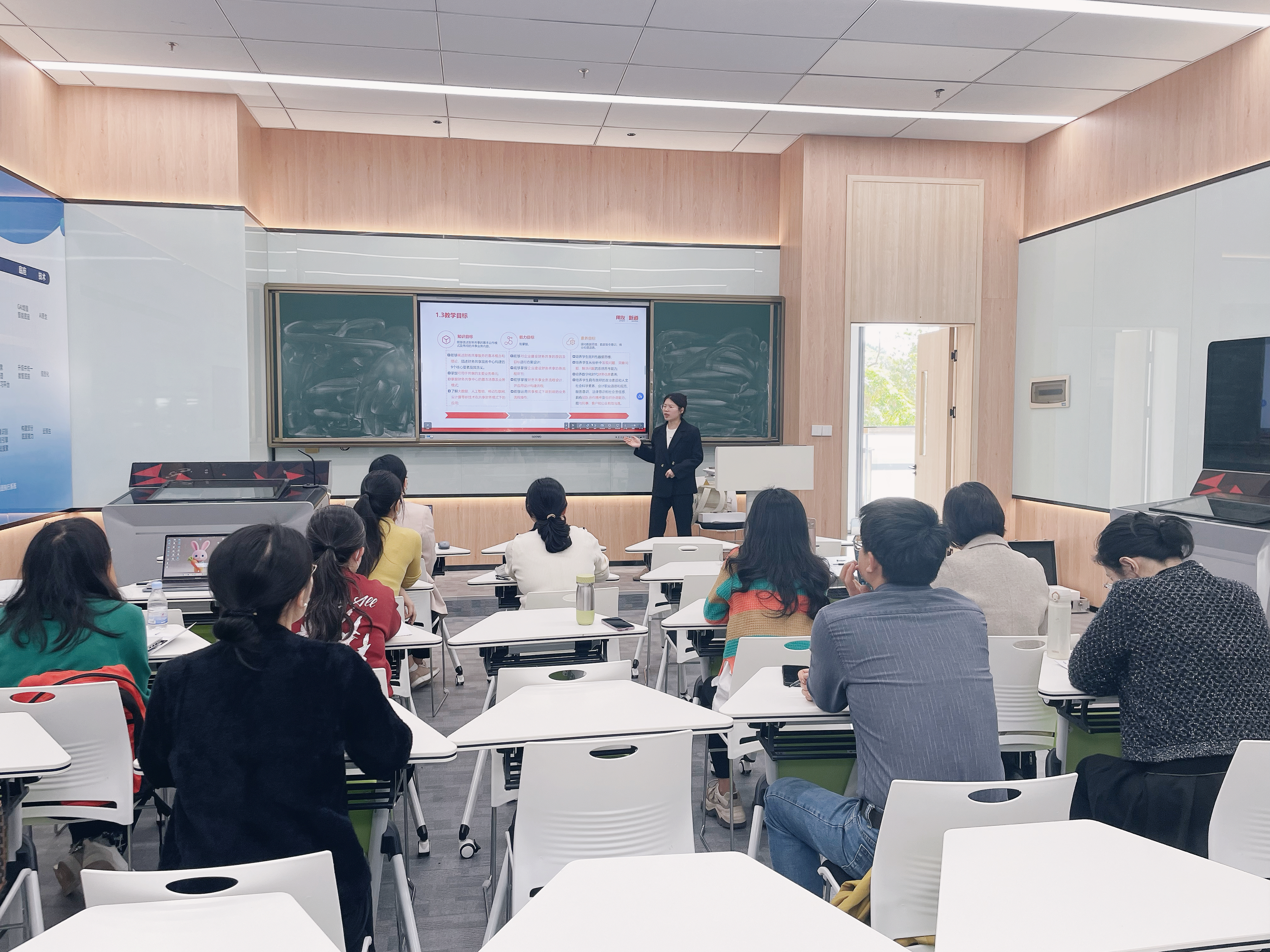 为深度对接数字经济时代财务行业发展需求,夯实《智能财务共享服务》课程教学基础,强化师资队伍实践教学能力,2025年12月18日至19日,数字经济产业学院用友财务坊成功举办智能财务共享服务专项师资培训。本次培训特邀新道师资研修院认证讲师周秀芳主讲,全体财务管理专业教师在怀德大厦203用友财务坊集中参与沉浸式学习。