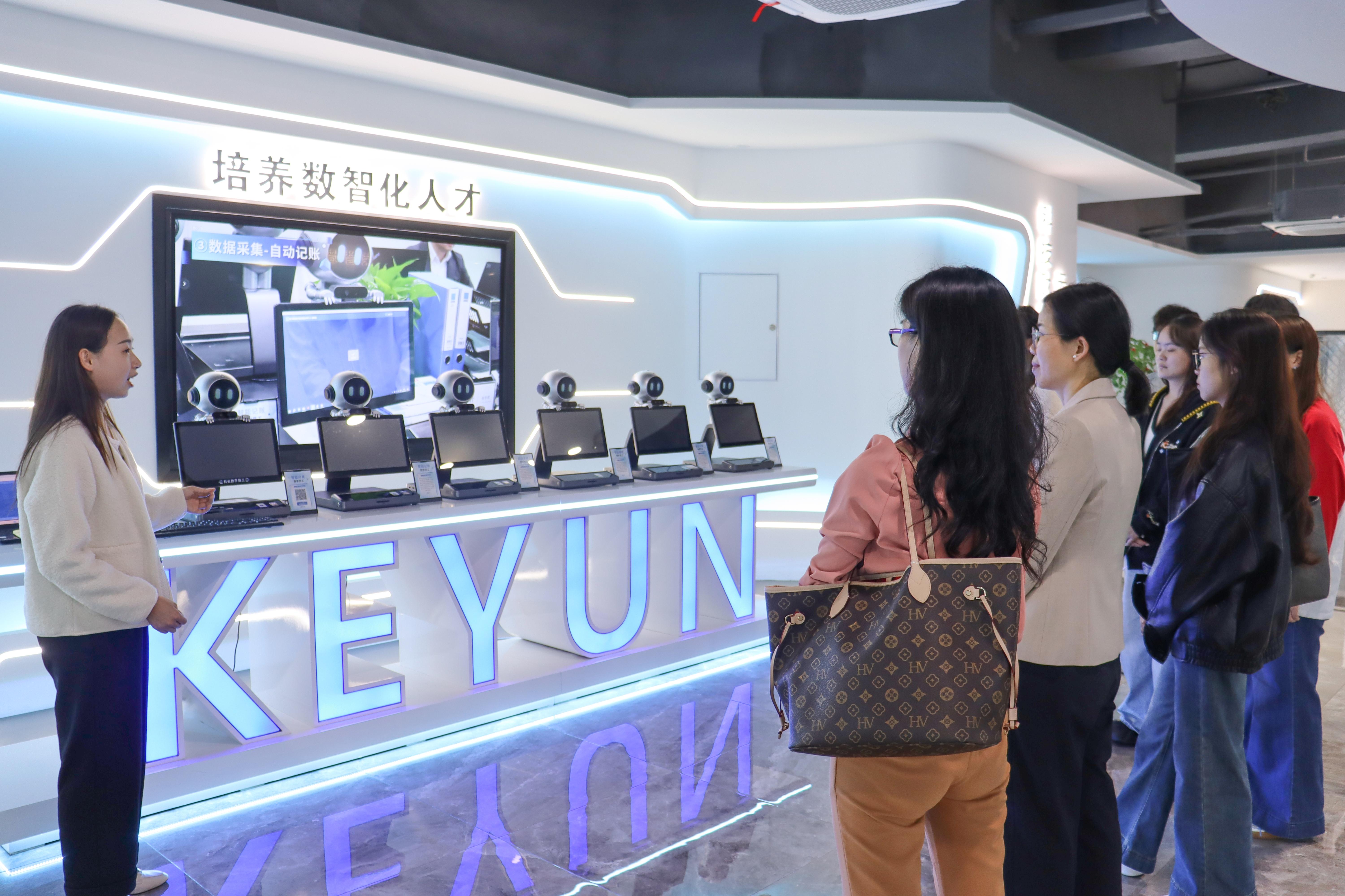 双方围绕行业发展与人才培养展开深度对话。王阿娜、林素娇老师先介绍了专业人才培养方案的制定思路、核心框架。黄秋香副经理结合企业经验,从课程与行业需求衔接、实践模块设计等方面分享观点,双方就人才培养与市场需求的匹配深入交流。实习与就业议题中,科云团队解读了财会行业就业趋势及岗位能力要求,为学生提供职业发展参考。针对全国大学生财会职业能力大赛,黄秋香副经理分享了赛事命题方向与备赛重点,并表示将为参赛学生提供专属实训资料与指导。随后,师生参观了公司展示大厅,近距离了解智能财税系统。