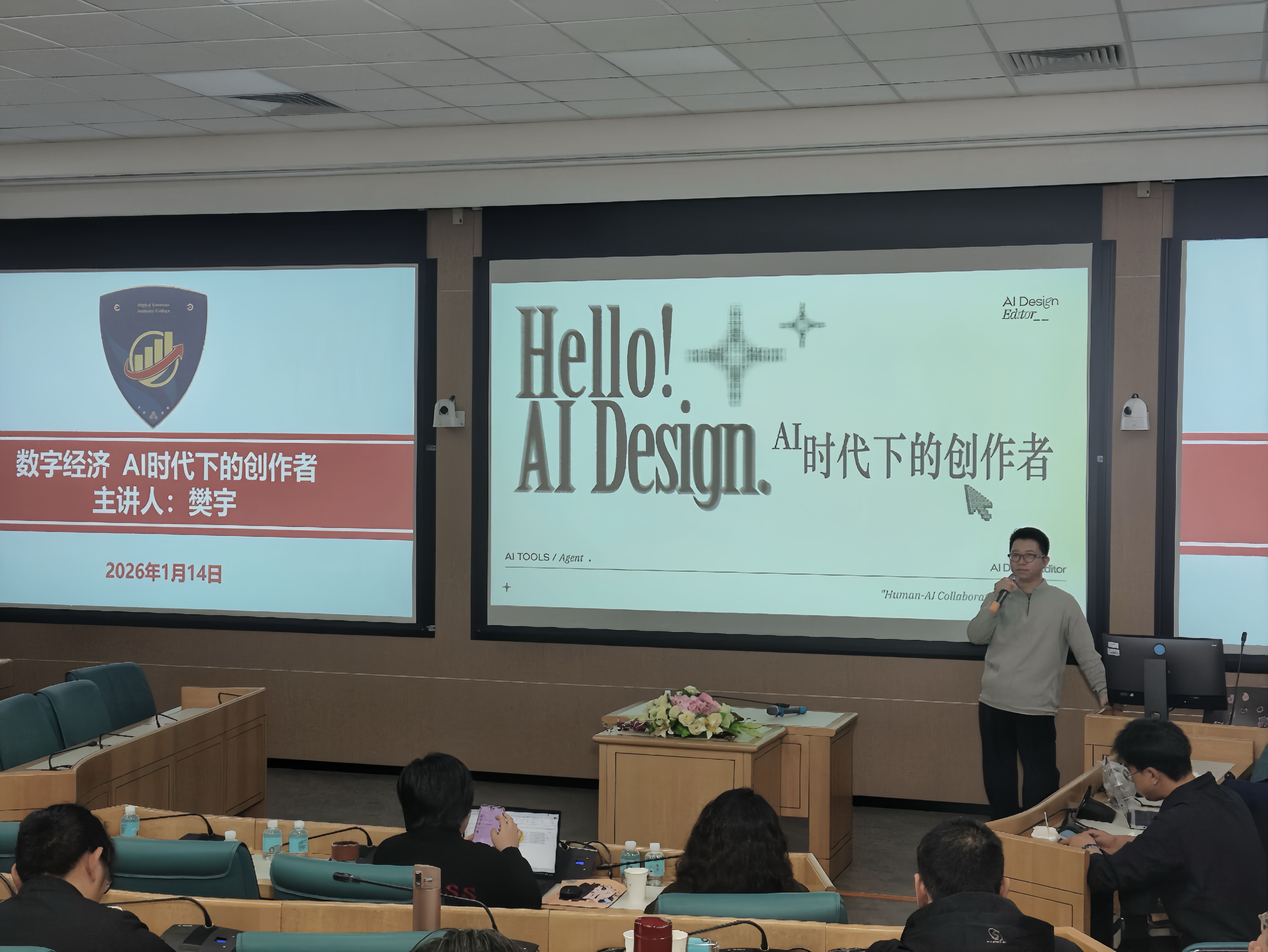 2026年1月14日,由数字经济产业学院主办的“数字经济,AI时代下的创作者”学术讲座在合一报告厅顺利举行。阿里巴巴国际数字商业集团设计中心AIGC业务高级专家樊宇先生受邀担任主讲,与商学院教师共话品牌设计与AI技术的创新实践。