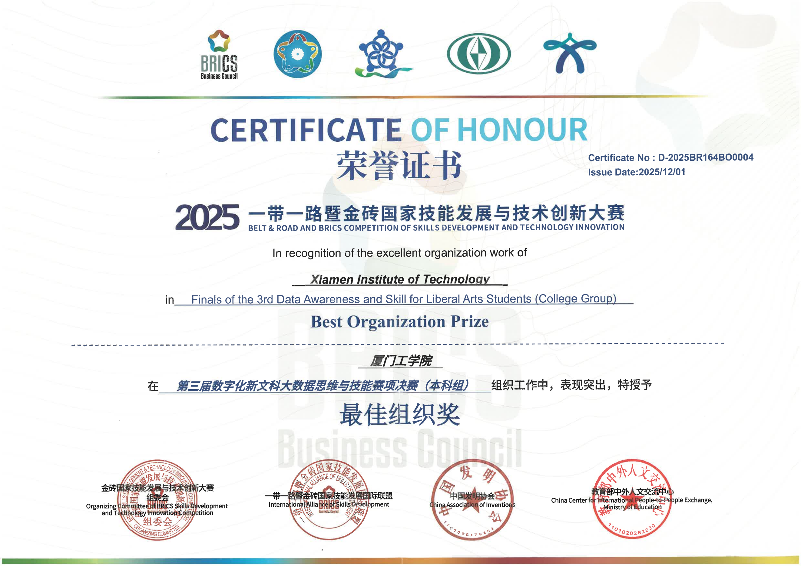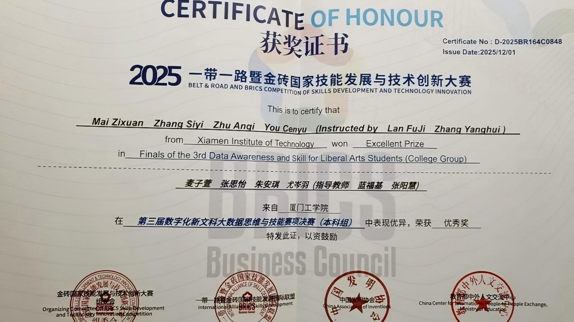 近日,2025“一带一路”暨金砖国家技能发展与技术创新大赛——数字化新文科大数据思维与技能赛项圆满落幕。厦门工学院商学院首次组织学生参加竞赛,便凭借扎实的专业功底与高效的团队协作,从众多高校中崭露头角,一举夺得最佳组织奖、优秀指导教师奖及全国竞赛一等奖等多个重要奖项,彰显了学院在数字化新文科人才培养上的卓越成果。