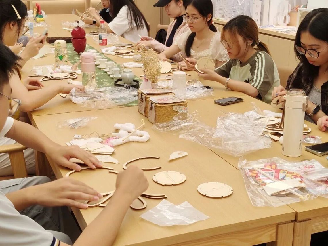 随后,同学们纷纷动手实践,手持木质框架、绢布、装饰配件等材料,从结构组装到图案装饰,每一步都精心操作,沉浸在手工创作的乐趣中。现场还专门设置交流环节,同学们积极分享创作思路,刘琴老师则有针对性地提供指导,助力大家完善作品。