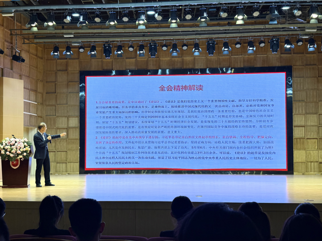 朱瑞元书记首先结合了党的二十届四中全会精神与“十四五”规划建议,强调在当前百年未有之大变局下,坚持党的创新理论引领具有深远意义。他指出,“十四五”规划建议是凝聚全党智慧、发扬民主、面向未来的纲领性文件,清晰擘画了中国式现代化的发展路径,彰显了我们党始终依靠人民、为了人民的根本立场。面对复杂严峻的外部环境,我们必须坚定发展信心,依托我国强大的经济韧性与制度优势,在风险挑战中赢得战略主动。