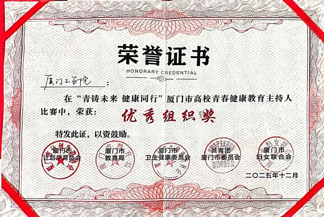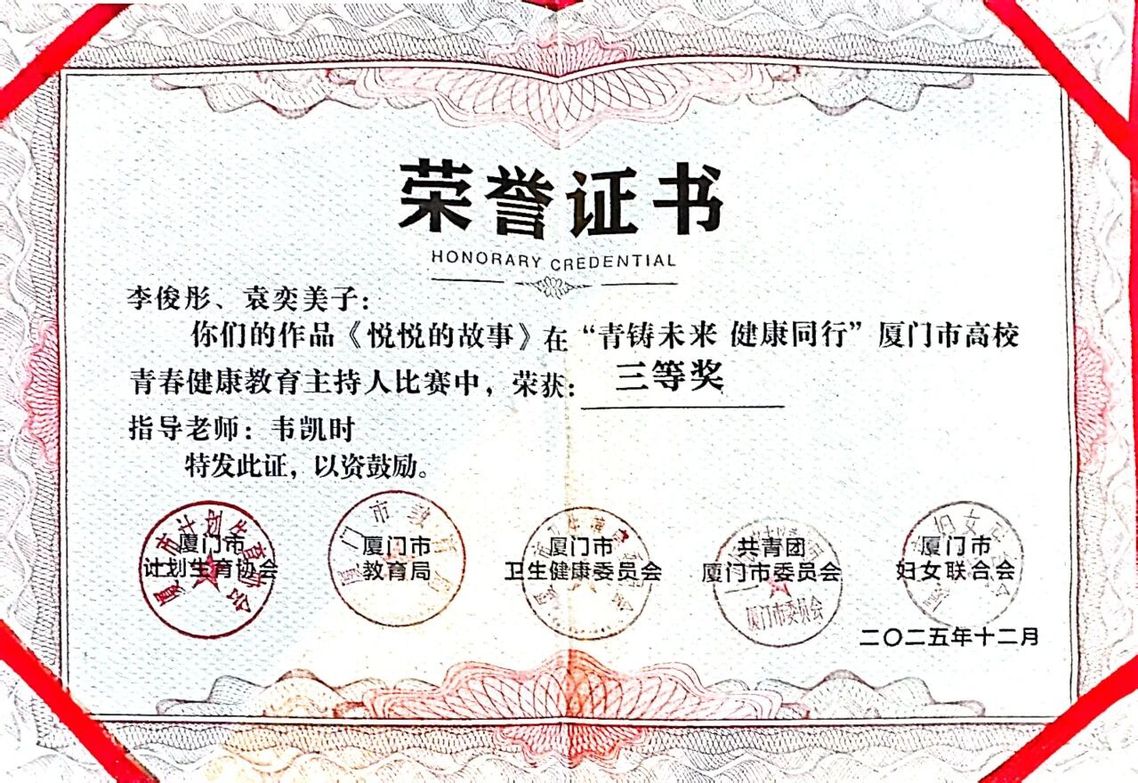 其中,我校选送的参赛作品《悦悦的故事》表现突出。该作品由校团委副书记韦凯时老师担任指导教师,李俊彤、袁奕美子两位同学共同完成,聚焦青少年成长过程中常见的心理困惑与健康认知误区,创新采用“情景叙事+知识科普”的呈现形式,既生动还原了青少年成长场景,又精准传递了青春健康知识,凭借专业的内容设计与出色的现场表现,赢得了评委组的高度认可,最终荣获“青铸未来健康同行”厦门市高校青春健康教育主持人比赛三等奖。同时,我校因在赛事组织、选手选拔与培育等工作中的突出表现,被授予“青铸未来健康同行”厦门市高校青春健康教育主持人比赛优秀组织奖。