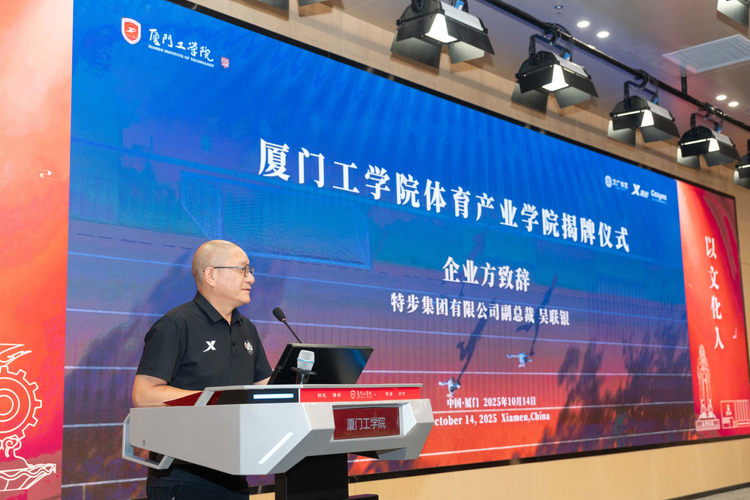 特步集团有限公司副总裁吴联银在发言中表示,特步集团秉持“传递奔跑的力量”使命,致力于构建以“训练+社交+活动+赛事”为核心的跑步生态圈。他指出,此次共建产业学院是双方从深厚合作迈向战略共建的重要跨越。双方已成功合作多届校园马拉松赛事及共同举办高校5K联赛,成立特跑族厦工学院分会,并正式签订战略合作协议,建立起“情感+专业”的双重联结。未来,特步将围绕四项重点深化合作:开展跑步教练员、急救跑者与配速员培训,推动专业人才共育;加强学生文创与视觉设计能力输出,促进融合创意实践;设立校园跑步服务中心,打造“体育+教育”创新生态;整合培训、赛事与合作伙伴资源,实现“1+1>2”的协同效应。