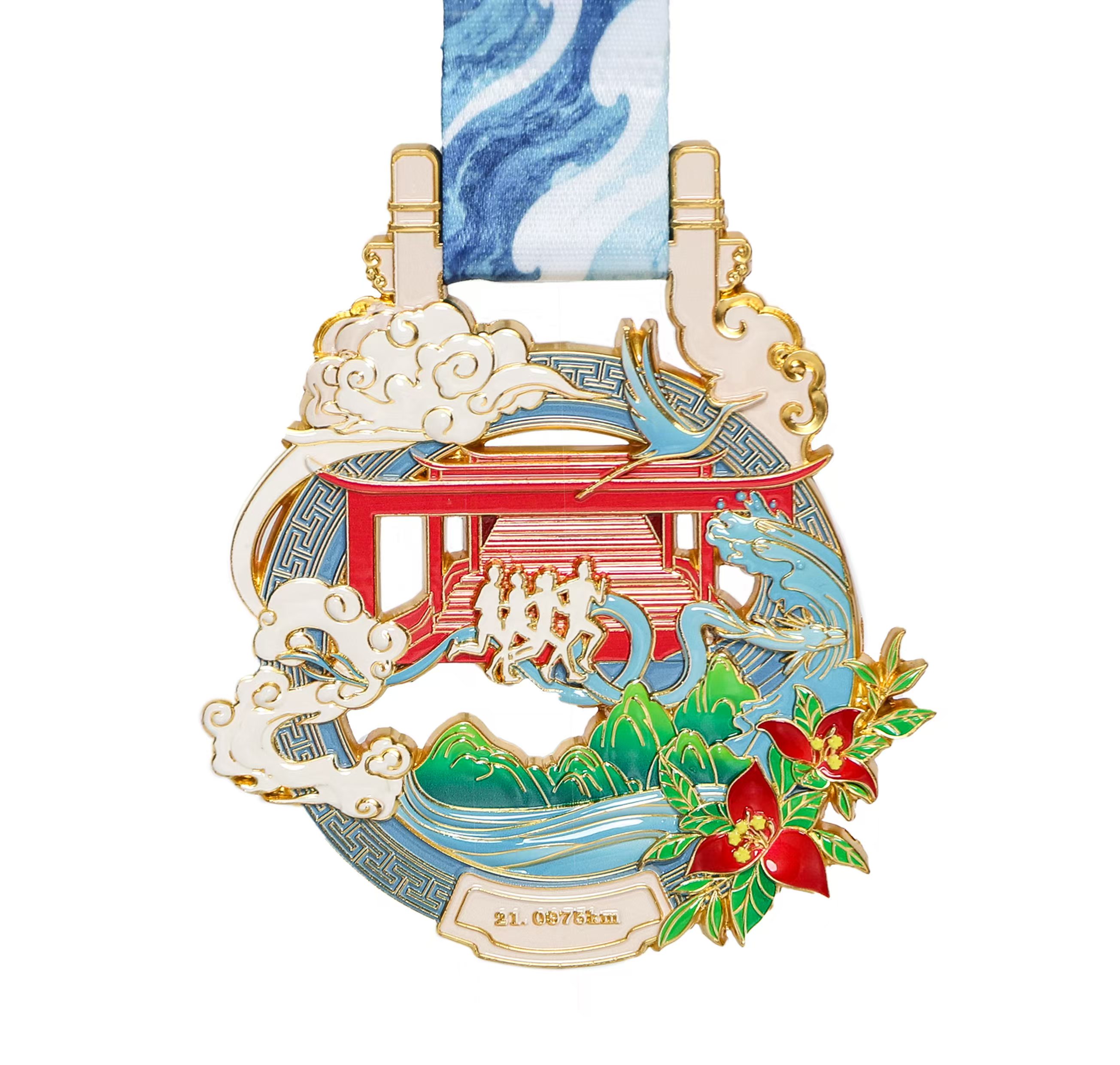 这块奖牌色彩斑斓、工艺精致,融合了传统文化元素与现代运动精神。飞龙、祥云、山水和花卉相映成趣,寓意拼搏与荣誉交织,既有力量感,也有艺术美。