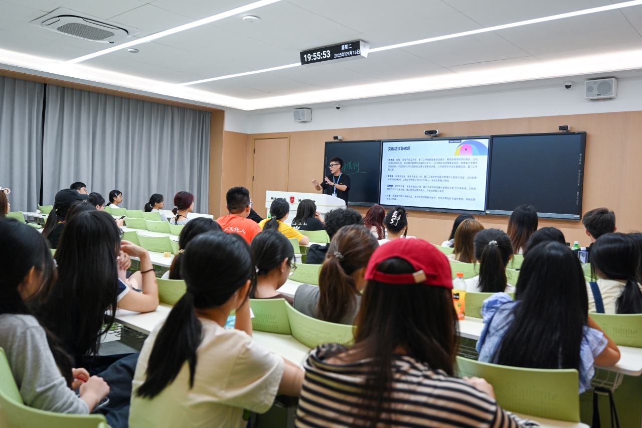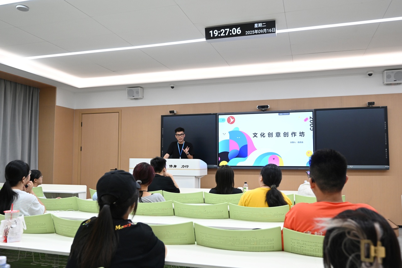紧接着,文创坊负责人应志远老师向新成员们介绍了坊内的几位指导老师,让大家更清晰地了解今后将会跟随学习与交流的方向;随后,他又结合实际,谈到了坊内需要遵守的规章制度。在分享中,应老师强调,学生的创作应源于内心的热爱与探索,而非单纯为了比赛而创作。因此,文创坊的学生总是先有了作品,再去寻找适合的比赛参加,这样的机制有效消除了学生的功利心态,同时也保证了作品风格的多样性和原创性。