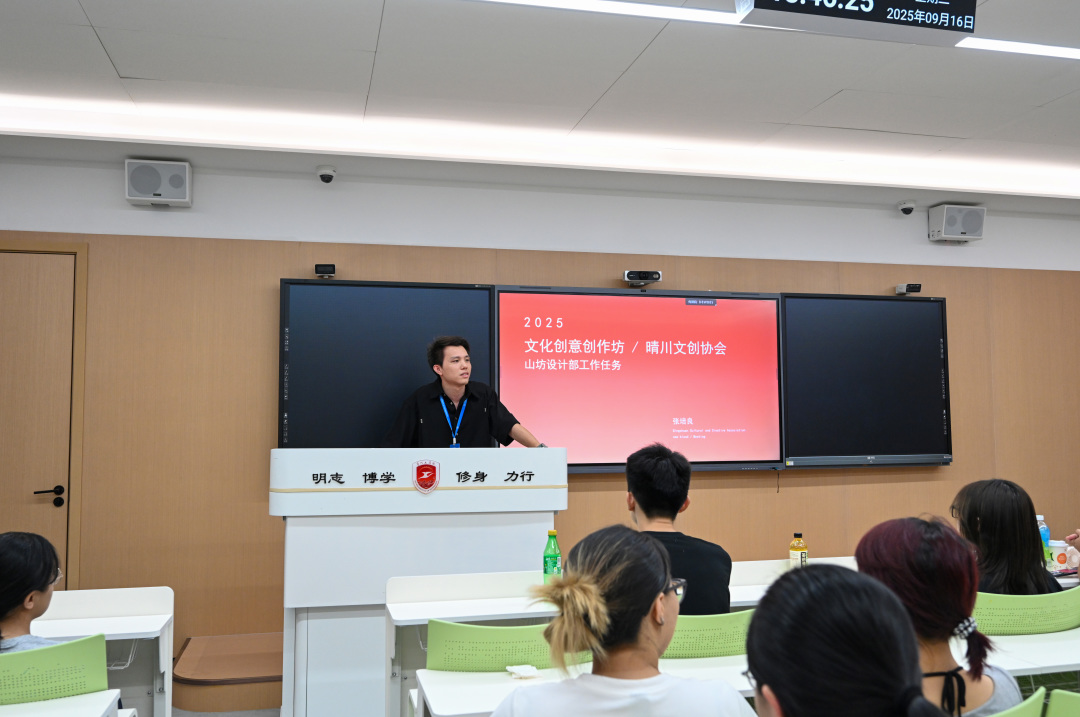 张培良老师在见面会上为大家详细介绍了山坊设计的主要工作方向。他结合实际案例,展示了协会在海报、标识和IP设计等方面的成果,并分享了如何从构思到成品的完整流程。