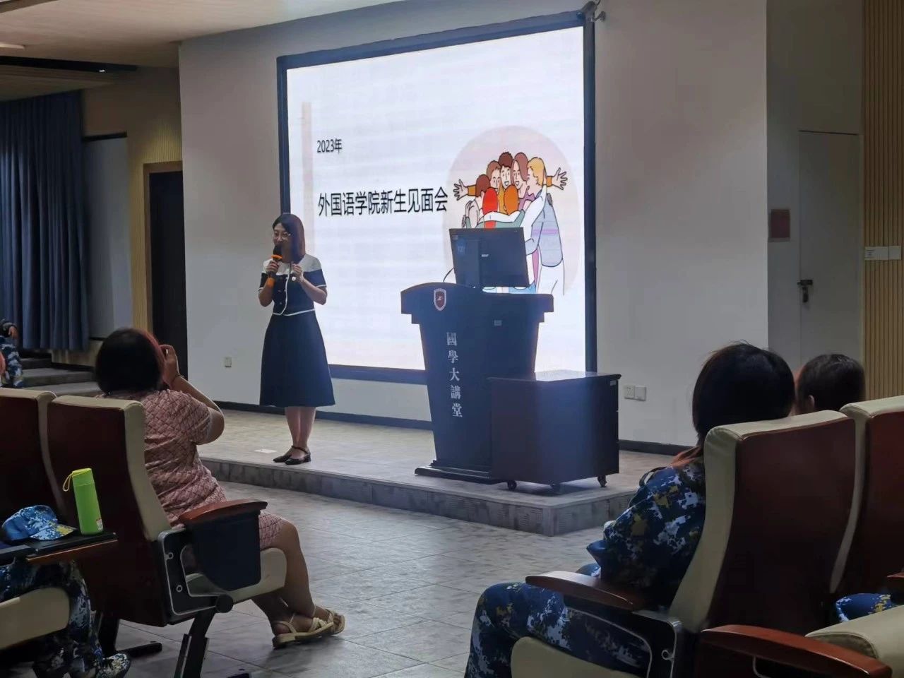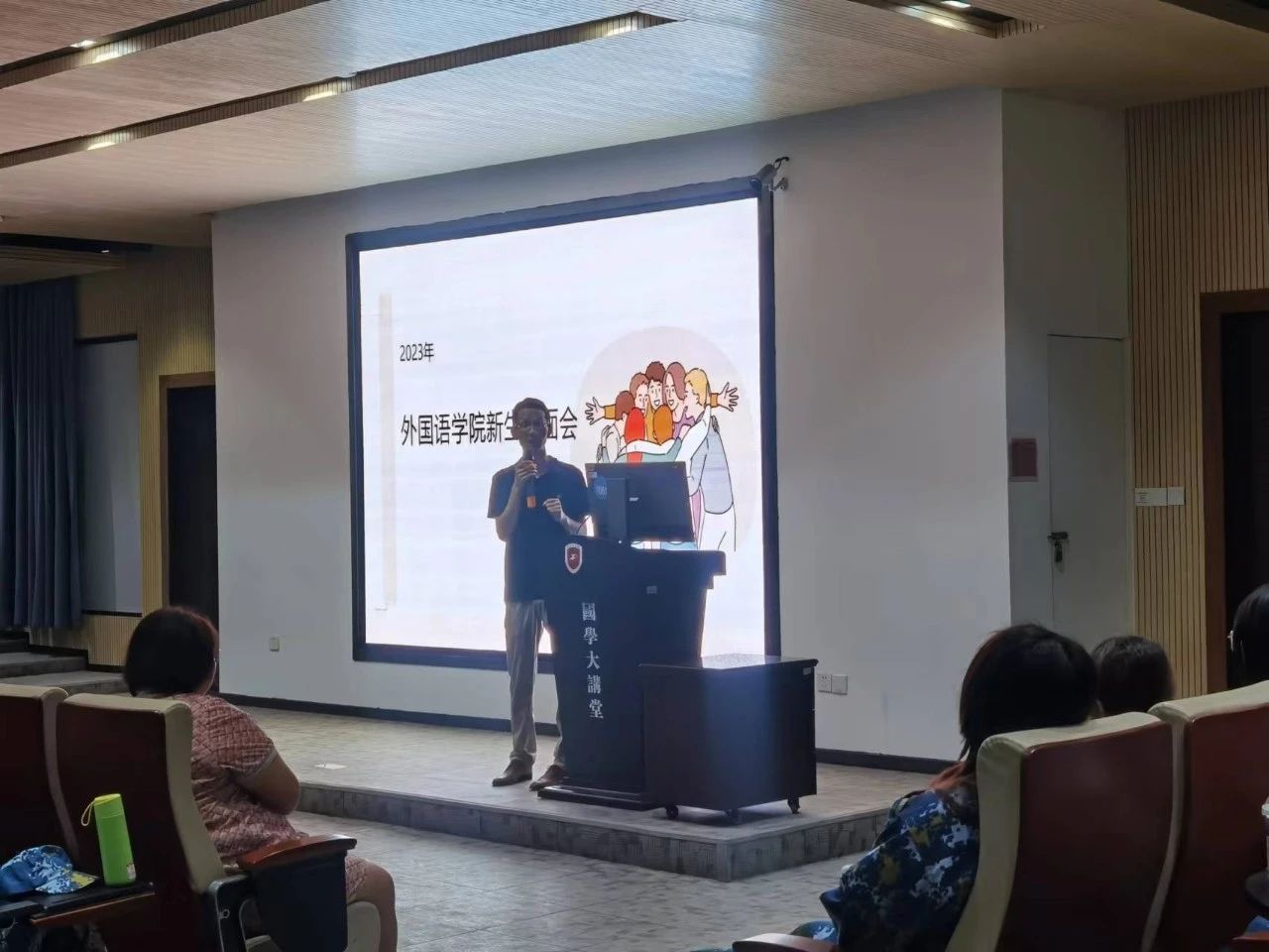 2023年9月12日,外国语学院在国学大讲堂召开新生见面会。外国语学院院长邱能生、执行院长黄颖思、学术副院长喻新宇、行政副院长肖芳浩以及2023级全体新生班级导师参加会议。