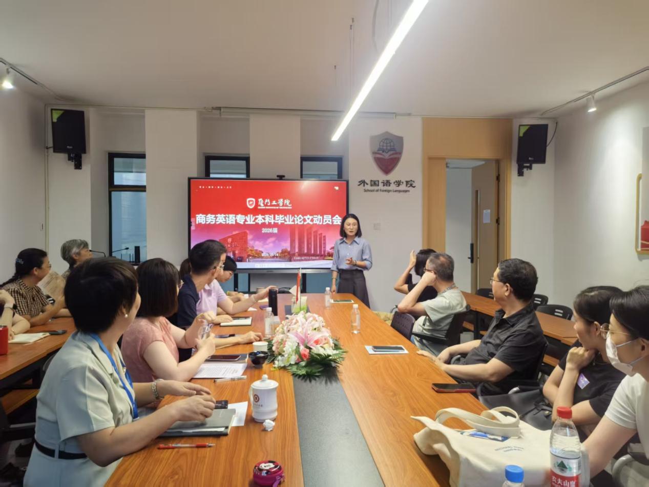 2025年10月14日下午,厦门工学院外国语学院在明德408召开2026届商务英语专业本科毕业论文教师会。会议由外语类课程教研组副主任王碧荣主持,外国语学院学术院长邱能生、执行院长黄颖思、学术副院长喻新宇及全体商务英语毕业论文指导老师共同参与。