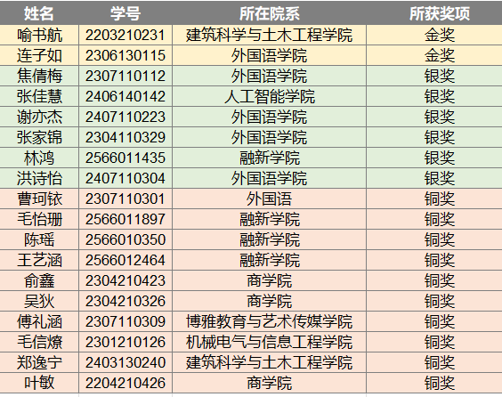 根据大赛章程中关于校赛奖项规定,依据线上初赛成绩,设置金、银、铜奖,现公布获奖名单如下: