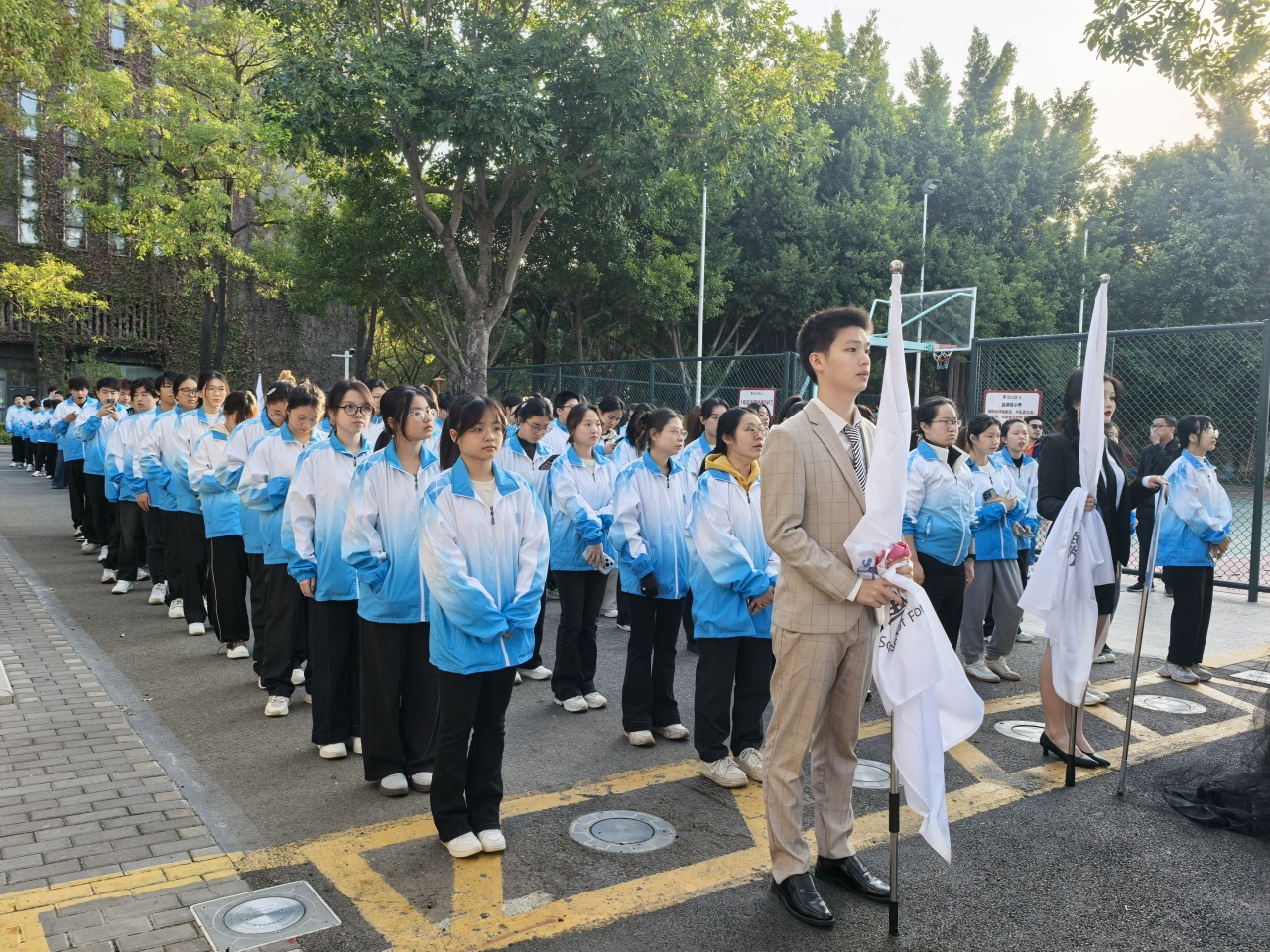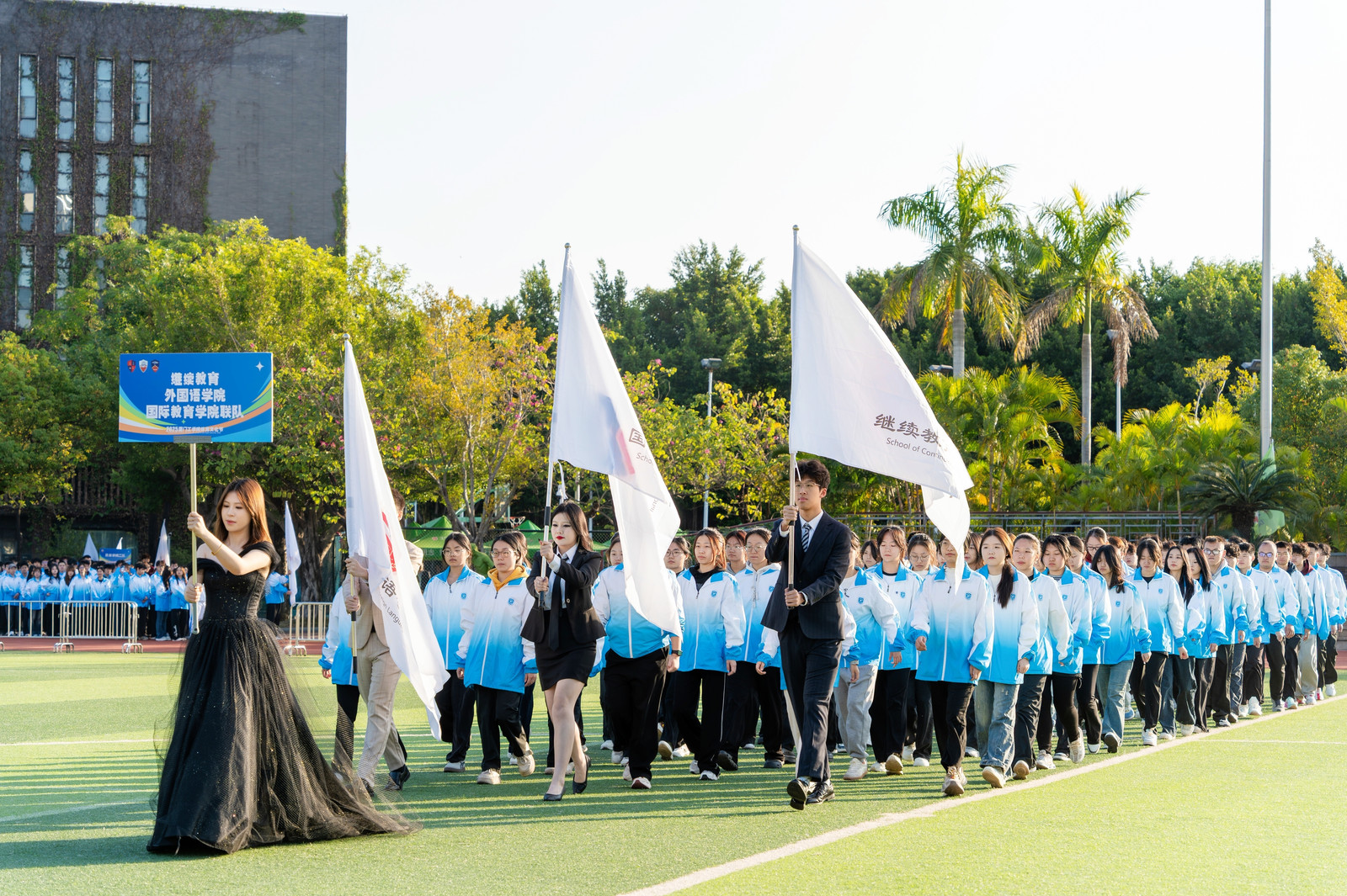 运动会首日,晨光点亮赛场。外国语学院方阵紧随校方阵大部队,以铿锵有力的步伐步入运动场,看台上掌声如雷,正式拉开了这场青春盛典的序幕。