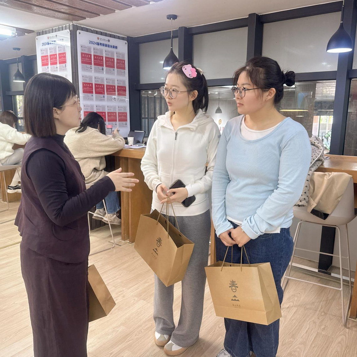 为帮助考研学子缓解备考压力,坚定考研信心,2025年12月15日,外国语学院开展了“研途温暖”主题活动,外国语学院执行院长黄颖思、办公室副主任吕思琪、外语类课程教研组副主任王碧荣、毕业班辅导员郭爽、商务英语专业金子骞老师、以及日语专业罗新梅老师来到研究生辅考学院,为考研学子送上暖心关怀和真挚祝福。