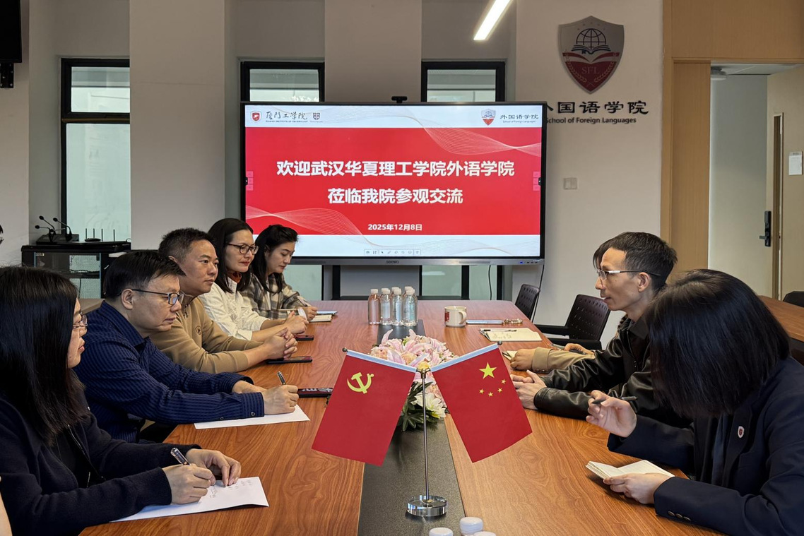 2025年12月8日,武汉华夏理工学院外国语学院院长刘沛教授率队访问我院,双方围绕新时代外语人才培养与学科发展展开深入交流。我院学术院长邱能生教授、学术副院长喻新宇教授及各专业负责人参加研讨。