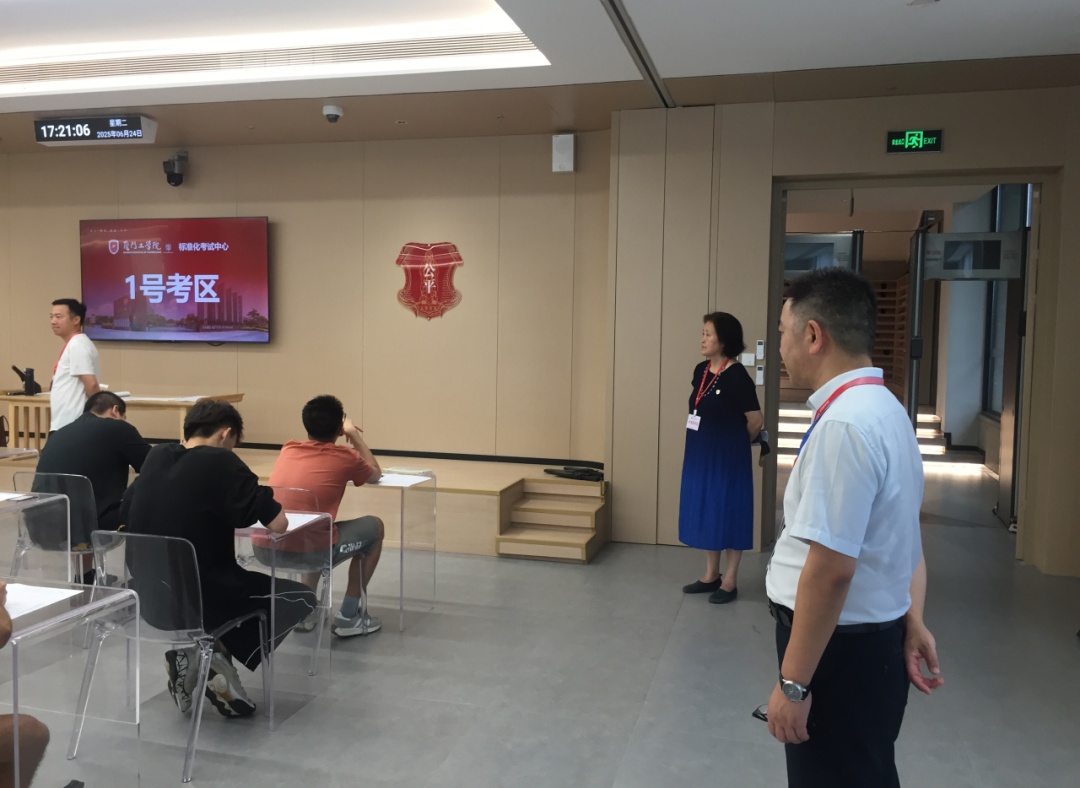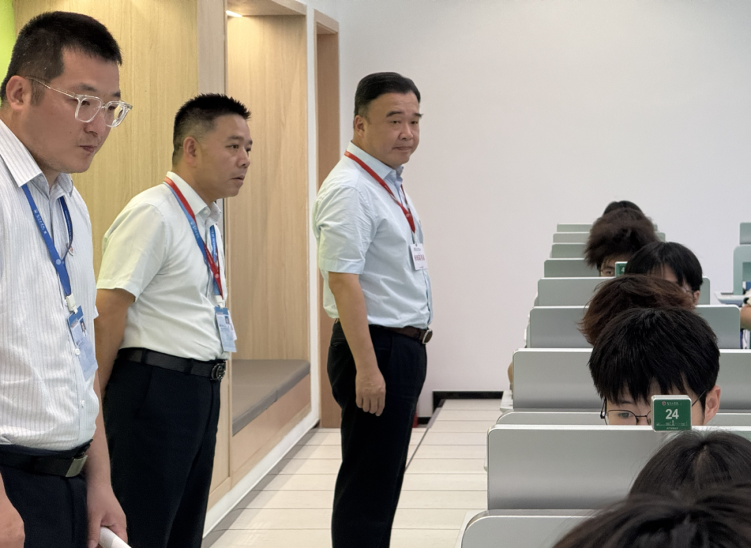 本次考试场地包含新投入使用的标准化计算机考试中心。校领导现场查看机考情况,重点检查机房设备运行状态、屏幕防窥措施,强调机房监考需关注考生操作规范与设备异常处理;同时与工作人员就“行为检测系统”使用细节、突发情况应急预案等进行交流,并随机询问考生对考场环境的反馈。