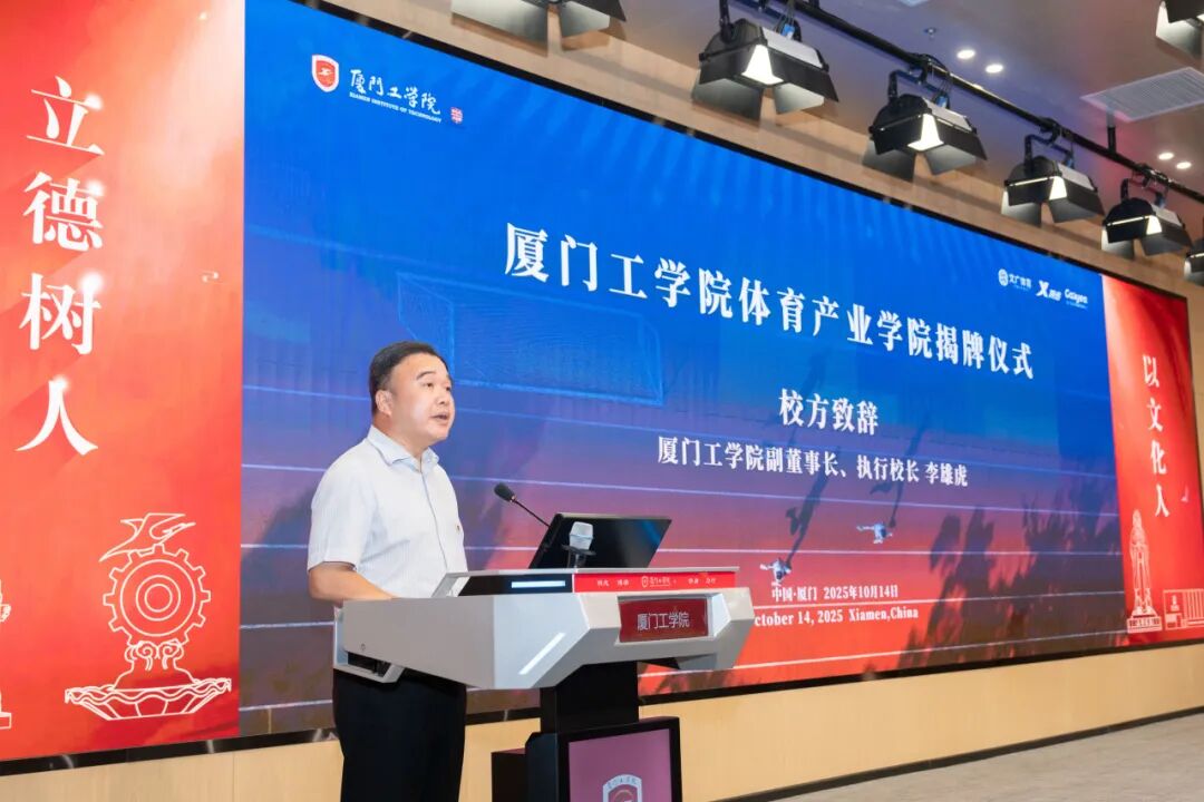 厦门工学院副董事长、执行校长李雄虎代表学校致辞。他表示,体育产业学院的成立是学校响应国家“加快建设体育强国”战略、深化高阶教学改革的重要举措。学院将聚焦体育健康与体育赛事产业,与厦门文广体育有限公司、特步集团有限公司、盖小亚(厦门)健康管理有限公司等企业携手,打造集人才培养、科学研究、技术创新、企业服务于一体的协同育人平台。学院将以“真实项目、共建共享、服务成长”为路径,推动教育链、产业链、创新链深度融合,培养“懂体育、善经营、会管理”的复合型应用人才。