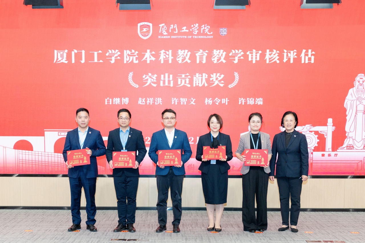 苏涵校长,校党委朱瑞元书记,李雄虎副董事长、执行校长,李咏梅副校长,李文副校长颁发“厦门工学院本科教育教学审核评估突出贡献奖”。